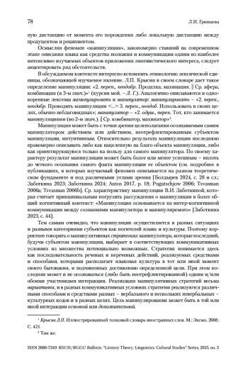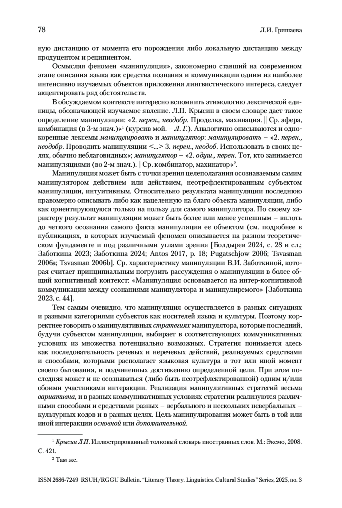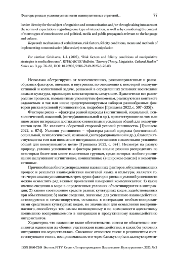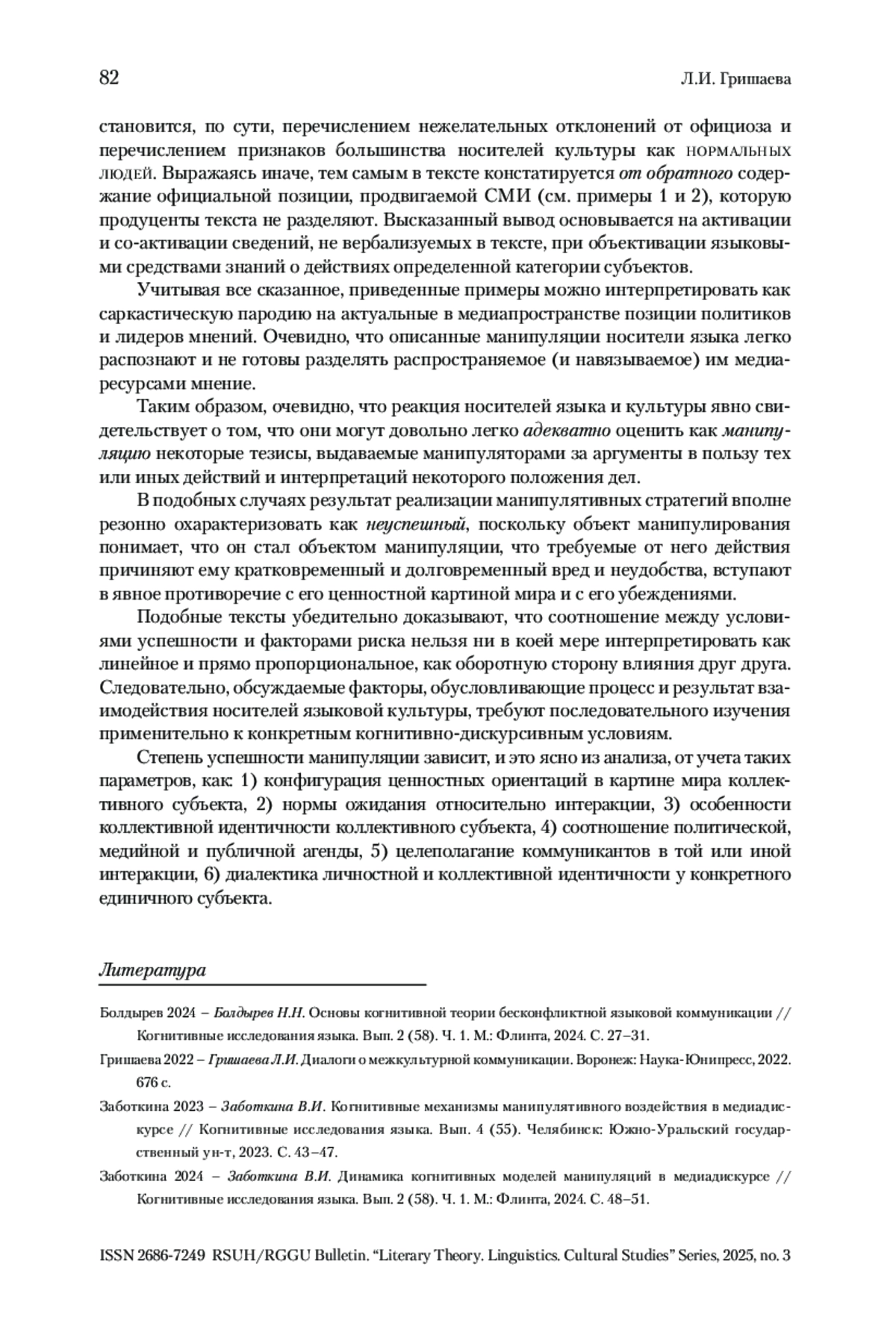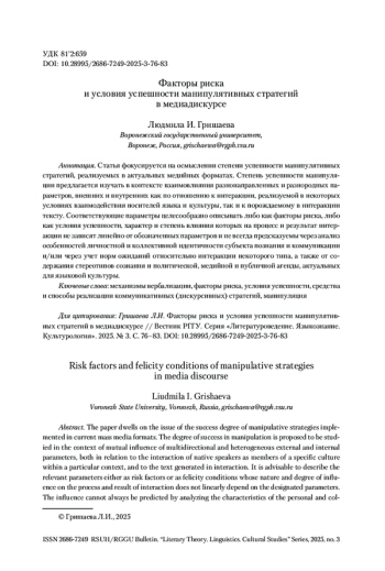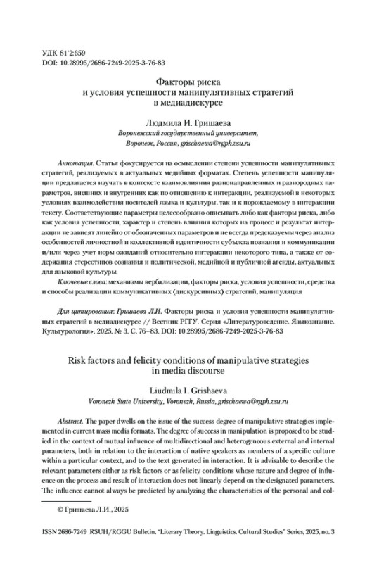 ГРИШАЕВА Л. И. ФАКТОРЫ РИСКА И УСЛОВИЯ УСПЕШНОСТИ МАНИПУЛЯТИВНЫХ СТРАТЕГИЙ В МЕДИАДИСКУРСЕ // ВЕСТНИК РГГУ. СЕРИЯ «ЛИТЕРАТУРОВЕДЕНИЕ. ЯЗЫКОЗНАНИЕ. КУЛЬТУРОЛОГИЯ». 2025. № 3