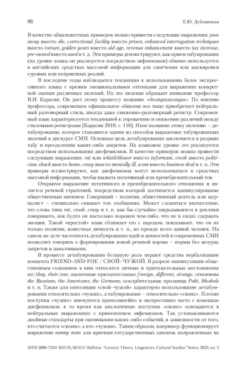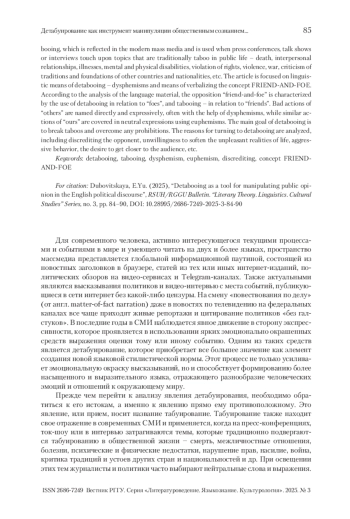 Данное исследование рассматривает дисфемизацию эвфемистических единиц как средство манипулирования общественным сознанием. Целью исследования является выявление факторов, влияющих на изменение коннотации эвфемистических единиц в дискурсе социальных сетей. В ходе исследования выдвинута гипотеза о триггерах (предпосылках) превращения эвфемизма в дисфемизм. Удалось выделить три самых продуктивных дискурсивных механизма формирования семантики амбивалентных эвфемистических единиц, а именно: 1) реализацию метафорических и метонимических концептуальных моделей; 2) нивелирование эвфемистического эффекта путем экспликации или использования синонима; 3) использование языковых единиц, характеризующихся амбивалентной коннотацией наряду с эвфемизмом. В процессе исследования были также описаны пять концептуальных моделей формирования фонда дисфемистических единиц в дискурсе социальных сетей. Сделан вывод о роли дисфемизации в процессе манипуляции общественным сознанием. На основе полученных результатов можно рассматривать дисфемизацию эвфемистических единиц как эффективный инструмент воздействия на общественное сознание и формирования определенного мнения о событиях или явлениях. Данное исследование позволяет более глубоко понять процессы манипуляции языком и выявить механизмы, с помощью которых происходит изменение коннотации слов и выражений в дискурсе социальных сетей.
