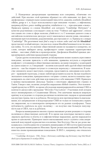 Социолингвистический и когнитивный конструкт национальной принадлежности на материале мультимедийного дискурса на английском и тем более на русском языках подвергается жесткому давлению и противостоянию на основе намеренно ложной информации, подмены одних понятий другими, полуправдивой информации и фейков, касающихся как исторического прошлого, так и настоящих событий, представленных в коммуникации. В работе представлены элементы подобного конструкта и обозначены приоритетные позиции сочетаемости в двух языках, а также комментируется диаграмма встречаемости слова идентичность в ХХ и ХХI вв. Формирование «асимметричной референциональной соотнесенности» происходит в рамках гибридности информационной войны и происходящих событий, направленных на русскоязычную культуру и человеческое сознание.