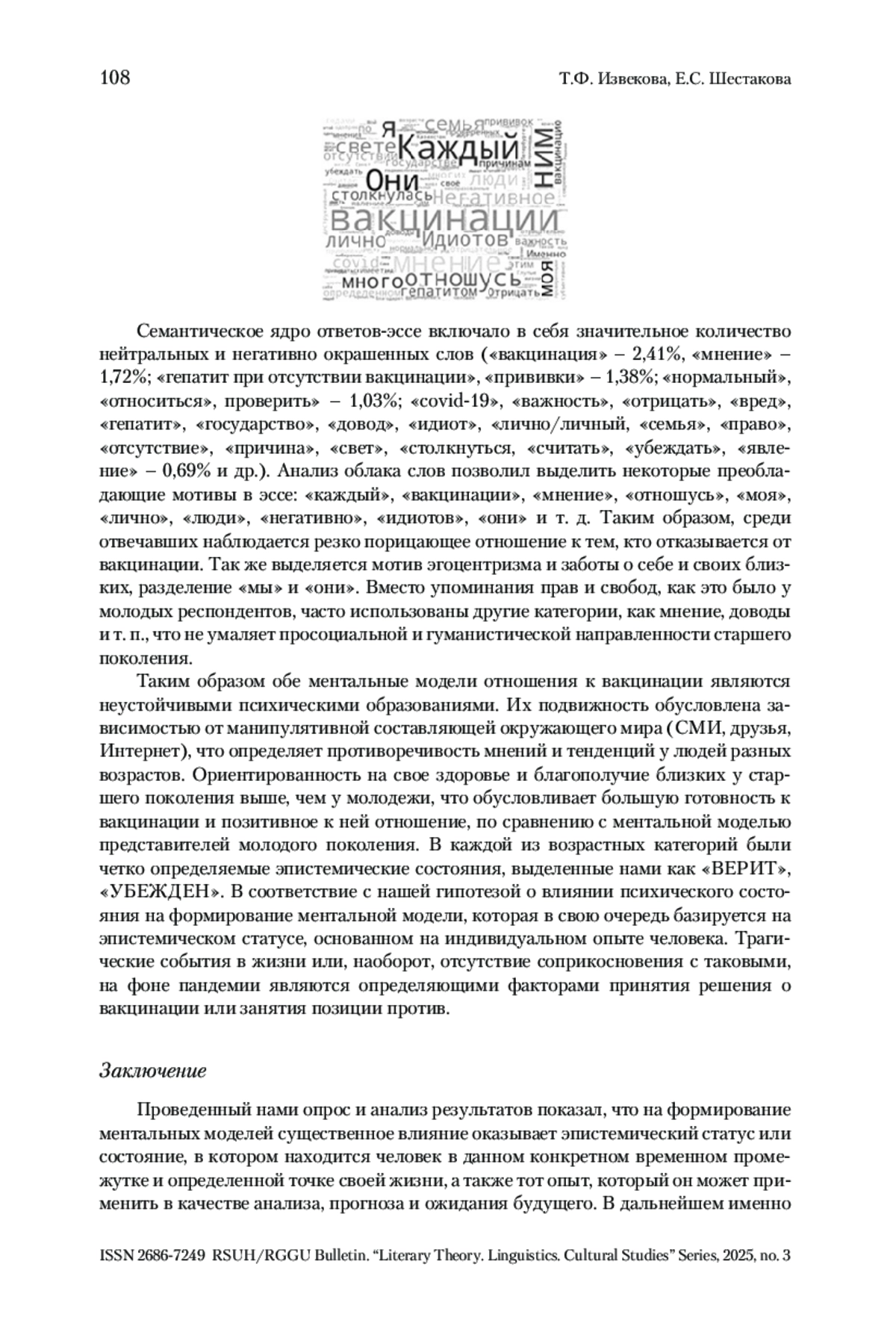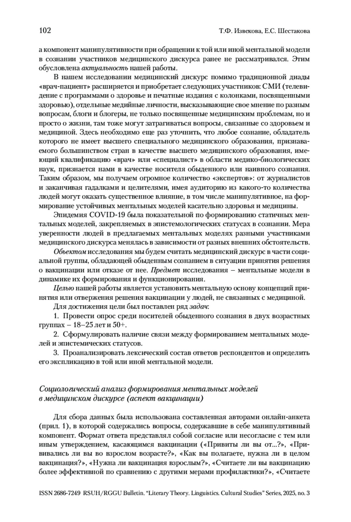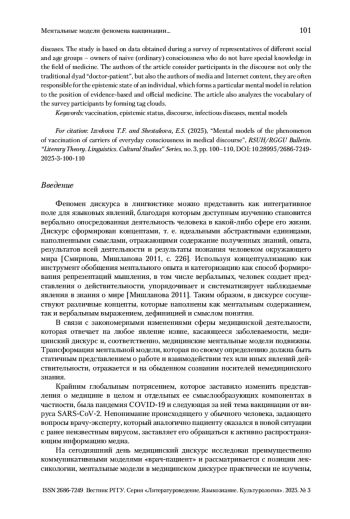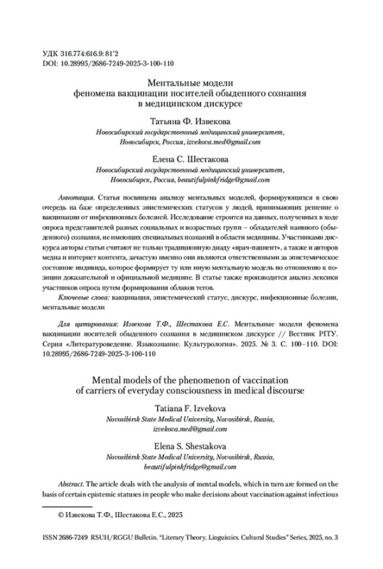 Статья посвящена анализу ментальных моделей, формирующихся в свою очередь на базе определенных эпистемических статусов у людей, принимающих решение о вакцинации от инфекционных болезней. Исследование строится на данных, полученных в ходе опроса представителей разных социальных и возрастных групп – обладателей наивного (обыденного) сознания, не имеющих специальных познаний в области медицины. Участниками дискурса авторы статьи считают не только традиционную диаду «врач-пациент», а также и авторов медиа и интернет контента, зачастую именно они являются ответственными за эпистемическое состояние индивида, которое формирует ту или иную ментальную модель по отношению к позиции доказательной и официальной медицине. В статье также производится анализ лексики участников опроса путем формирования облаков тегов.