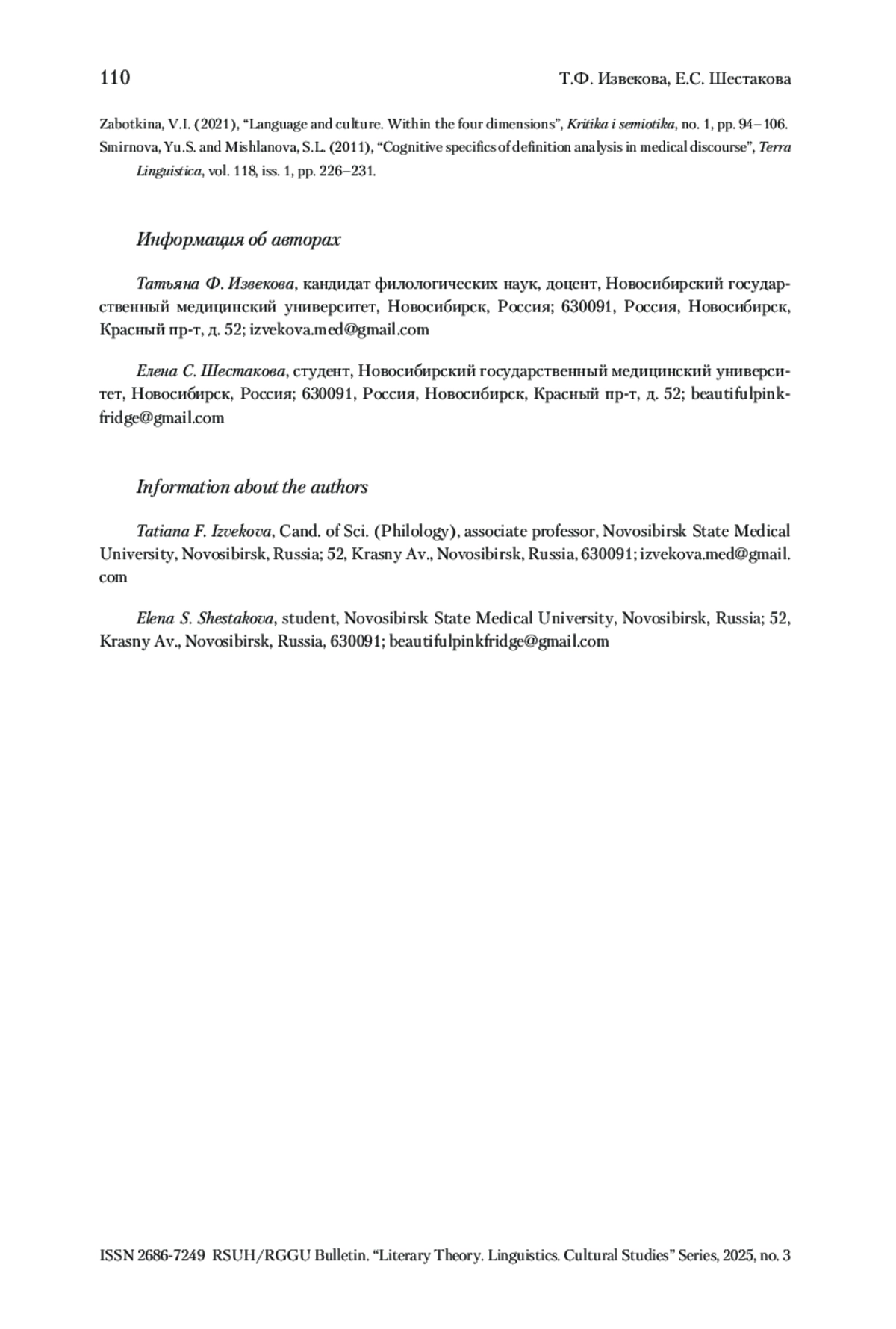 5. Смирнова, Мишланова 2011 - Смирнова Ю.С., Мишланова С.Л. Когнитивные особенности дефиниционного анализа в медицинском дискурсе // Terra Linguistica. 2011. Т. 118. Вып. 1. С. 226-231.