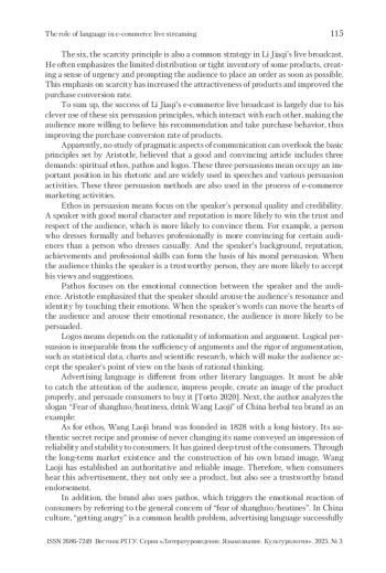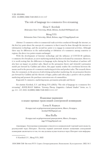 С развитием интернет-технологий и влиянием эпидемии COVID-19 прямые трансляции интернет-торговли, как новый метод маркетинга, были положительно восприняты потребителями. Однако стоит отметить, что различия в стилях речи ведущих во время прямого эфира также будут влиять на продажи товаров. Основываясь на теории убеждения и модели убеждения Аристотеля, выдвинутой Чалдини и другими, в данной работе в основном изучается взаимосвязь между средствами, используемыми в процессе маркетинговой деятельности в электронной коммерции, и продажами продукции. Исследование показывает, что для потребителей в процессе рекламы и маркетинга товаров шесть теорий убеждения, выдвинутых Чалдини, и риторика логоса, пафоса и этоса играют положительную роль в маркетинге товаров и способствуют повышению коэффициента конверсии покупки товаров.