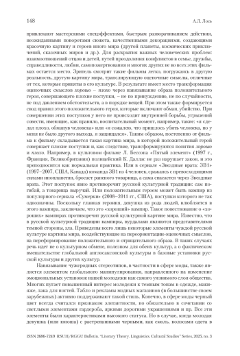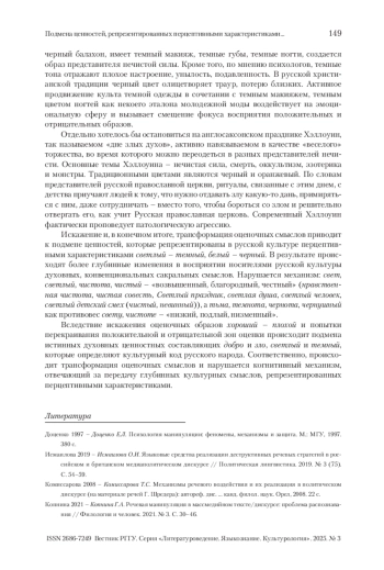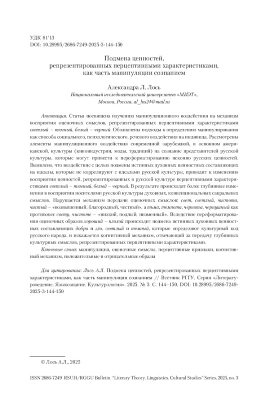 Статья посвящена изучению манипуляционного воздействия на механизм восприятия оценочных смыслов, репрезентированных перцептивными характеристиками светлый – темный, белый – черный. Обозначены подходы к определению манипулирования как способа социального, психологического, речевого воздействия на индивида. Рассмотрены элементы манипуляционного воздействия современной зарубежной, в основном американской, культуры (киноиндустрии, моды, традиций) на сознание представителей русской культуры, которые могут привести к переформатированию исконно русских ценностей. Выявлено, что воздействие с целью подмены истинных духовных ценностных составляющих на идеалы, которые не коррелируют с идеалами русской культуры, приводит к изменению восприятия ценностей, репрезентированных в русской культуре перцептивными характеристиками светлый – темный, белый – черный. В результате происходят более глубинные изменения в восприятии носителями русской культуры духовных, конвенциональных сакральных смыслов. Нарушается механизм передачи оценочных смыслов: свет, светлый, чистота, чистый – «возвышенный, благородный, честный», а тьма, темнота, чернота, чернушный как противовес свету, чистоте – «низкий, подлый, низменный». Вследствие переформатирования оценочных образов хороший – плохой происходит подмена истинных духовных ценностных составляющих добро и зло, светлый и темный, которые определяют культурный код русского народа, и искажается когнитивный механизм, отвечающий за передачу глубинных культурных смыслов, репрезентированных перцептивными характеристиками.