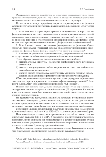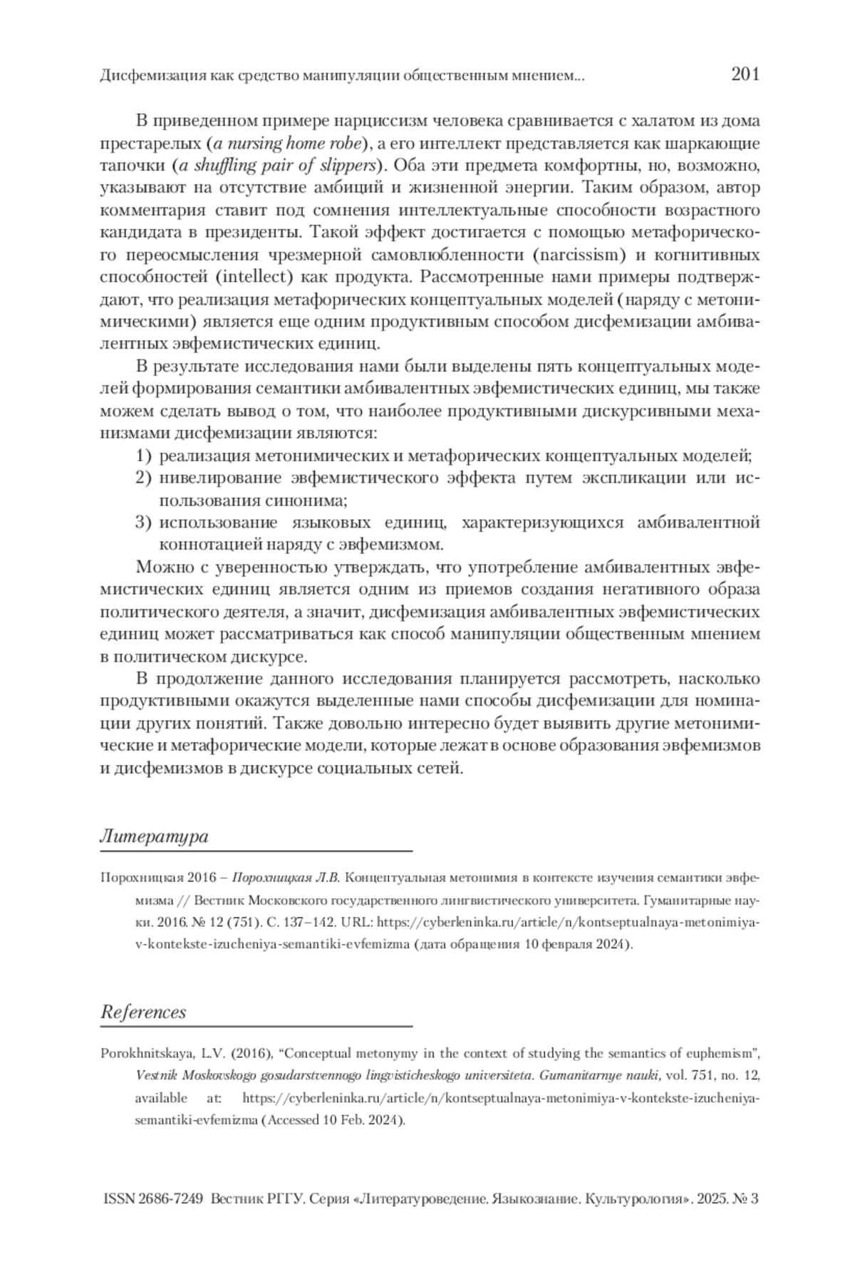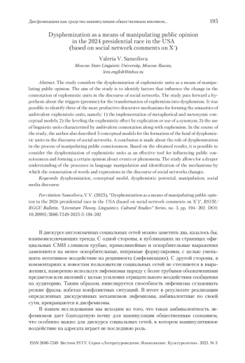 САМОЙЛОВА В. В. ДИСФЕМИЗАЦИЯ КАК СРЕДСТВО МАНИПУЛЯЦИИ ОБЩЕСТВЕННЫМ МНЕНИЕМ В ХОДЕ ПРЕЗИДЕНТСКОЙ ГОНКИ 2024 Г. В США (НА ПРИМЕРЕ КОММЕНТАРИЕВ В СОЦИАЛЬНОЙ СЕТИ X*) // ВЕСТНИК РГГУ. СЕРИЯ «ЛИТЕРАТУРОВЕДЕНИЕ. ЯЗЫКОЗНАНИЕ. КУЛЬТУРОЛОГИЯ». 2025. № 3