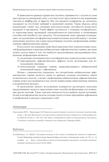Ключевые фразы: дисфемизация, КОНЦЕПТУАЛЬНАЯ МОДЕЛЬ, дисфемистический потенциал, манипуляция, дискурс социальных сетей