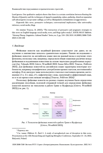 Целью данного пилотного исследования является изучение методов персуазивности в фейковых новостях с особым акцентом на их базовой таксономии и выявлении прагматических механизмов, таких как разговорные импликатуры, которые действуют в примерах с персуазивным характером. Предварительный анализ англоязычных социальных сетей и англоязычных блогов и новостей показывает использование схожих методов персуазивности со значительно более высокой частотой использования эмоционально заряженного языка в социальных сетях. Возможно, различия в использовании вытекают из характеристик анализируемых жанров. Наш качественный анализ показывает, что существует определенная корреляция между пренебрежением максимой количества и методами Обращения к популярности, ценностям, авторитету, Атаки на репутацию (все подкатегории, кроме обзываний), а также Манипулятивных формулировок (преувеличений).