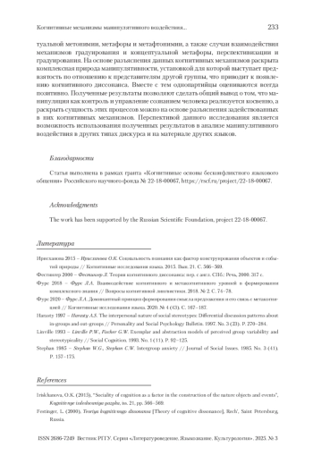 Рассматриваются экспрессивные инфлуктивные речевые акты комплимента, порицания и оскорбления в когнитивном и коммуникативном аспектах. Определяется роль речевых актов комплимента, порицания и оскорбления в формировании категории инфлуктивности. Материалом для анализа послужили комплиментарные, порицательные и оскорбительные экспрессивные инфлуктивные речевые акты, взятые из Британского национального корпуса. Анализ проводится на материале английского языка. Когнитивные модели экспрессивных инфлуктивных речевых актов «комплимент», «порицание» и «оскорбление», способных осуществить манипулятивное воздействие, представляются в виде конфигурации фреймов, что позволяет системно идентифицировать манипулятивные характеристики экспрессивных инфлуктивных речевых актов. На основе анализа механизма концептуального проецирования между ядерными и периферийными слотами фреймов комплимента, порицания, оскорбления и манипуляции делается вывод о важной роли инфлуктивов при манипуляции. Устанавливается необходимость в рассмотрении фрейма надежности и смежных с ним фреймов комфорта, безопасности, контроля и доверия в целях предотвращения манипулятивного воздействия. Доказывается динамическое взаимодействие внутри конфигурации фреймов «манипуляция», «комплимент», «порицание», «оскорбление», «надежность», «комфорт», «безопасность», «контроль», «доверие». Представляется модель, описывающая корреляцию изучаемых инфлуктивных фреймов с фреймом «манипуляция».