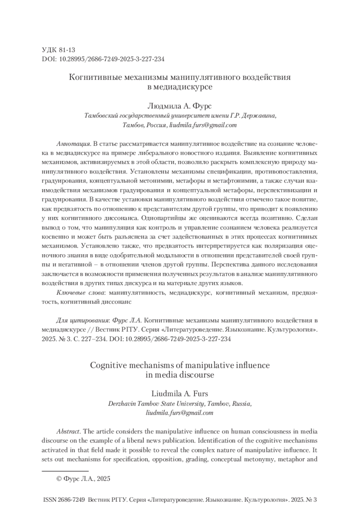 В статье представлено новое междисциплинарное проблемное поле гуманитарного знания, а именно поле манипулятивного воздействия в медиадискурсе. Акцент делается на необходимости создания интегрированного знания в данном проблемном поле. Предлагается динамическая многоуровневая когнитивная мегамодель манипуляции, которая представлена на трех уровнях когнитивной динамики. Привлекаются данные из психологии, нейронаук, искусственного интеллекта, теории подталкивания. В основе многоуровневой мегамодели лежит универсальная когнитивная операция концептуального проецирования между различными доменами знания и структурирующими их фреймами, вовлеченными в процесс манипуляции. Мы ставим вопрос о том, каков характер когнитивной обработки информации в данном процессе. Мы приходим к заключению о необходимости анализа взаимодействия между типом концептуального проецирования и типом когнитивных сбоев, возникающих в результате манипуляции. Особое внимание в статье уделяется вопросу вовлечения в процесс манипуляции искусственного интеллекта и, в частности, больших языковых моделей (LLM) – GPT-4. Предлагается также изучить роль искусственного интеллекта как манипулятора и как идентификатора манипуляции в медиадискурсе.