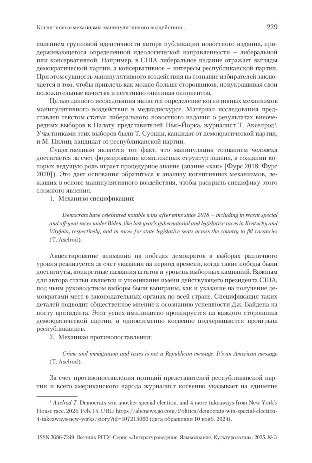 В статье рассматривается манипулятивное воздействие на сознание человека в медиадискурсе на примере либерального новостного издания. Выявление когнитивных механизмов, активизируемых в этой области, позволило раскрыть комплексную природу манипулятивного воздействия. Установлены механизмы спецификации, противопоставления, градуирования, концептуальной метонимии, метафоры и метафтонимии, а также случаи взаимодействия механизмов градуирования и концептуальной метафоры, перспективизации и градуирования. В качестве установки манипулятивного воздействия отмечено такое понятие, как предвзятость по отношению к представителям другой группы, что приводит к появлению у них когнитивного диссонанса. Однопартийцы же оцениваются всегда позитивно. Сделан вывод о том, что манипуляция как контроль и управление сознанием человека реализуется косвенно и может быть разъяснена за счет задействованных в этих процессах когнитивных механизмов. Установлено также, что предвзятость интерпретируется как поляризация оценочного знания в виде одобрительной модальности в отношении представителей своей группы и негативной – в отношении членов другой группы. Перспектива данного исследования заключается в возможности применения полученных результатов в анализе манипулятивного воздействия в других типах дискурса и на материале других языков.