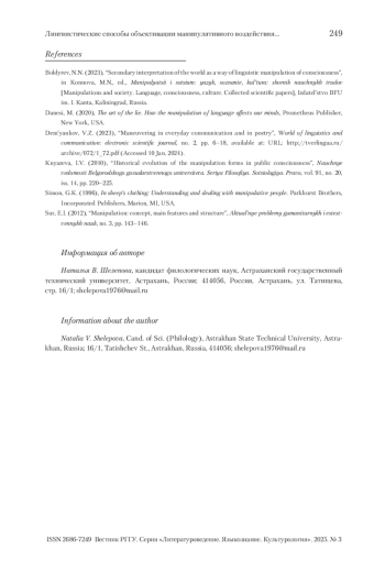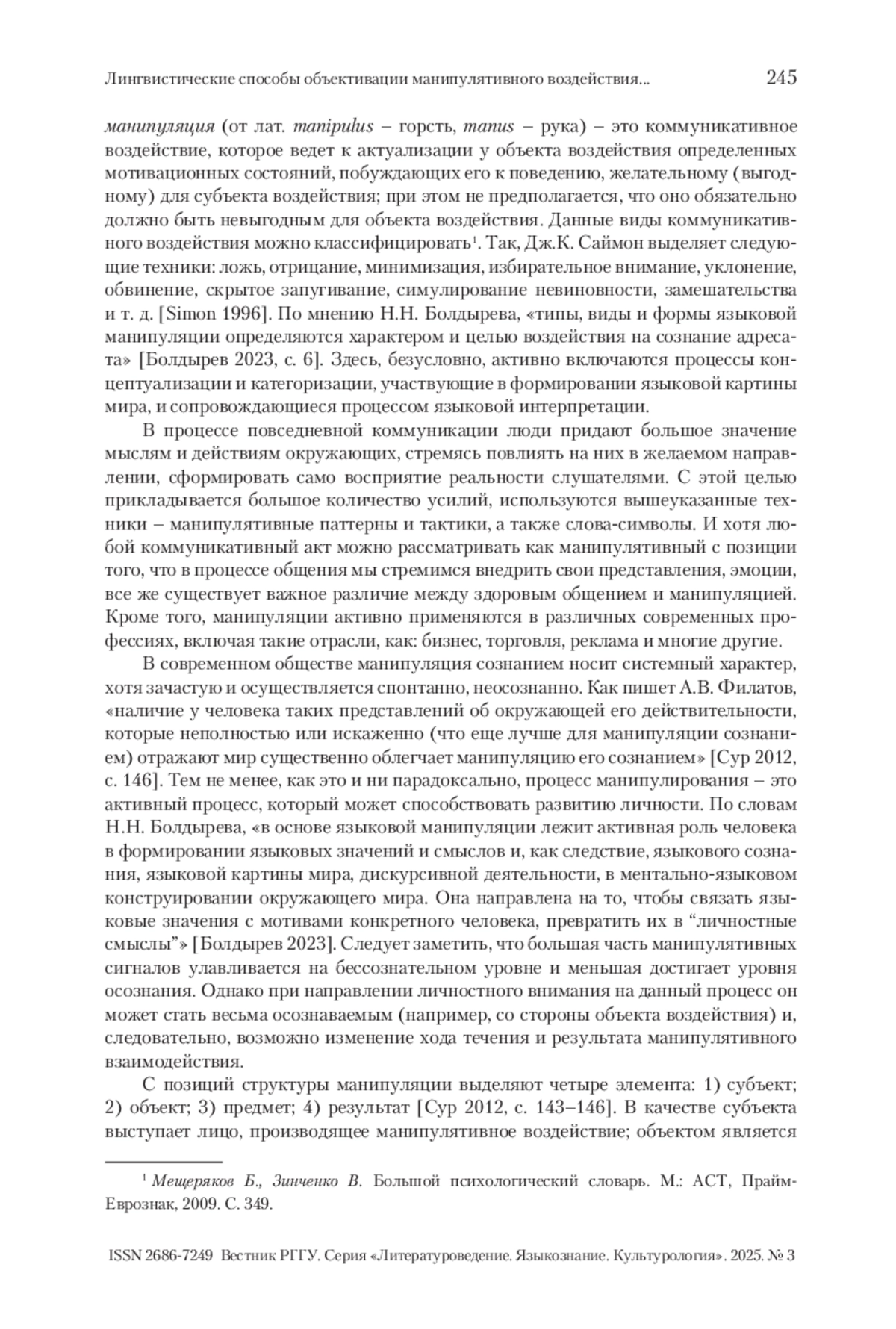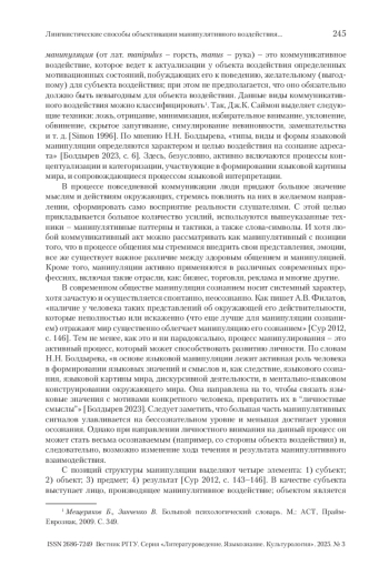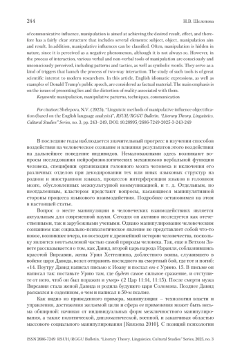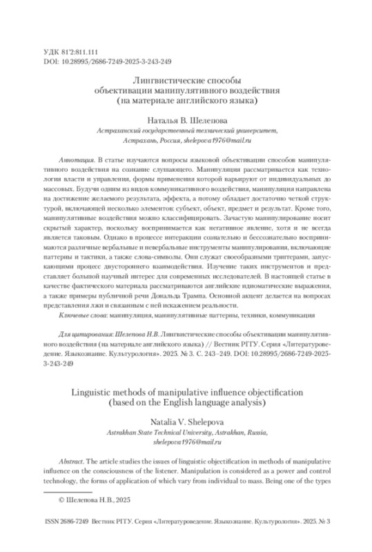 ШЕЛЕПОВА Н. В. ЛИНГВИСТИЧЕСКИЕ СПОСОБЫ ОБЪЕКТИВАЦИИ МАНИПУЛЯТИВНОГО ВОЗДЕЙСТВИЯ (НА МАТЕРИАЛЕ АНГЛИЙСКОГО ЯЗЫКА) // ВЕСТНИК РГГУ. СЕРИЯ «ЛИТЕРАТУРОВЕДЕНИЕ. ЯЗЫКОЗНАНИЕ. КУЛЬТУРОЛОГИЯ». 2025. № 3