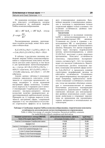 Цель работы - синтез, определение состава и прогнозирование констант стабильности комплекса La(III) с метилэтилпиридинолом и гекса(изотиоциано)хромат-(III) анионом. Методы исследования - инфракрасная, электронная спектроскопия, термический анализ, титриметрия, гравиметрия в сочетании с квантово-химическими расчетами MOPAC 2016 (UHF // PM7), ORCA v. 5.0.2 (DFT B3LYP // Sapporo TZP-2012, Sapporo-DKH3-TZP-2012). Результаты. Был установлен состав комплекса [La(MEP)₃(H₂O)₂][Cr(NCS)₆]·3H₂O.; координация La(III) происходит через гидроксильный атом кислорода лиганда, и наличие инертного аниона [Cr(NCS)₆]3⁻ было подтверждено спектроскопически. Экспериментальная константа стабильности была определена как lg β = 14,5, в то время как теоретическое моделирование показало сильную зависимость стабильности от природы донорных групп: карбоксилаты заметно повышают стабильность, тогда как объемные заместители снижают ее. Выводы. Полученные данные демонстрируют, что выбор лиганда сильно влияет на термодинамическую стабильность двойных комплексных солей, что важно для их применения в качестве термохромных индикаторов и потенциальных каталитических систем.