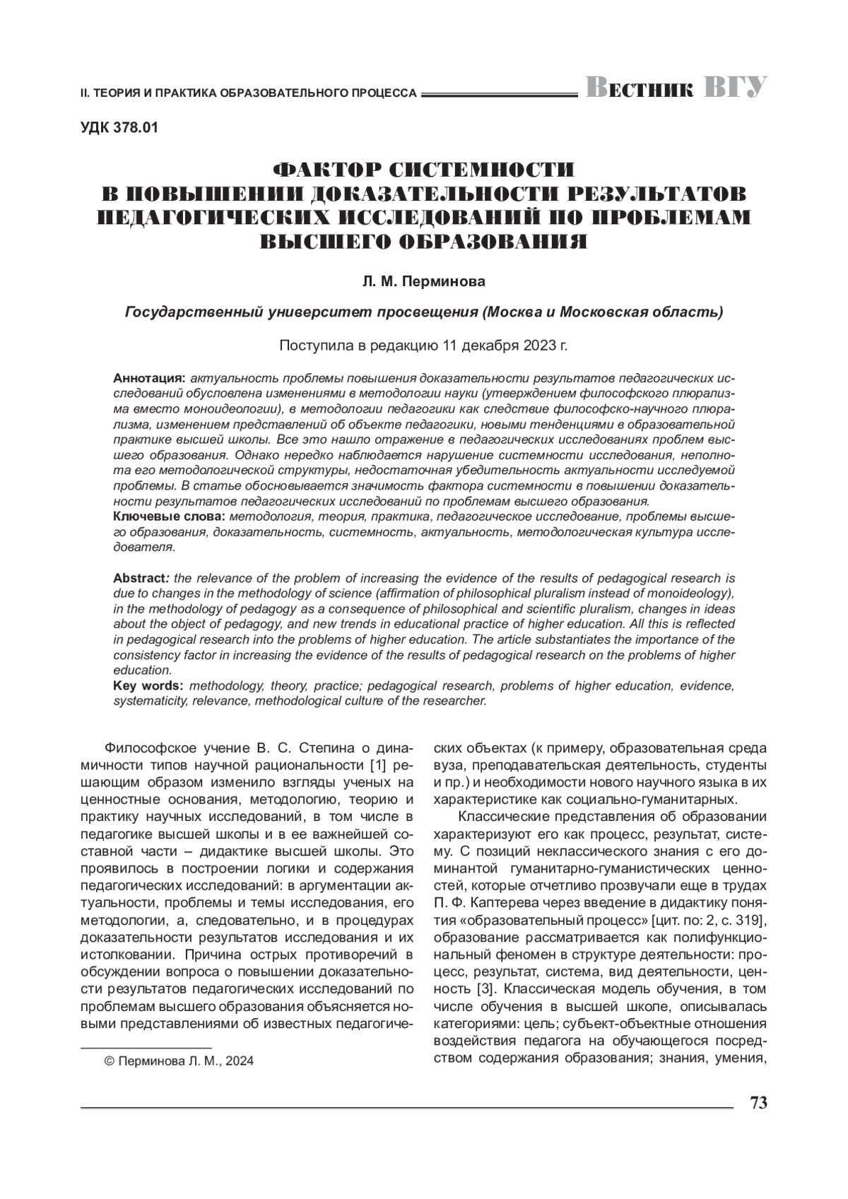 Статья: ФАКТОР СИСТЕМНОСТИ В ПОВЫШЕНИИ ДОКАЗАТЕЛЬНОСТИ РЕЗУЛЬТАТОВ ПЕДАГОГИЧЕСКИХ ИССЛЕДОВАНИЙ ПО ПРОБЛЕМАМ ВЫСШЕГО ОБРАЗОВАНИЯ (2024)