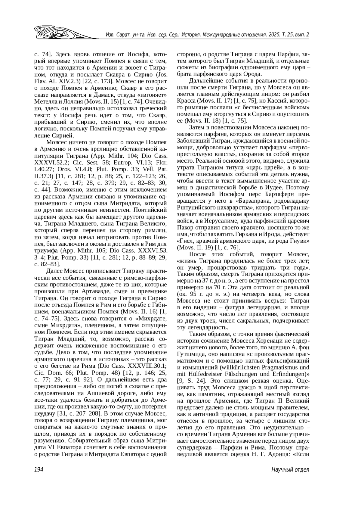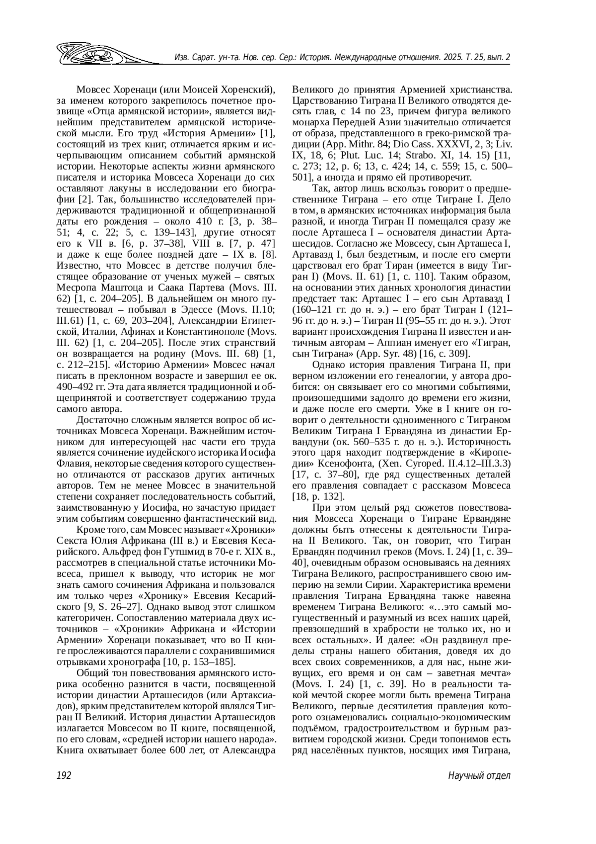 В статье рассматривается образ царя Великой Армении Тиграна II Великого в сочинении «отца армянской историографии» Мовсеса Хоренаци «История Армении». При написании глав, посвященных Тиграну II, Мовсес опирался прежде всего на сочинения Иосифа Флавия, а также две «Хроники» – Юлия Африкана и Евсевия Кесарийского. При этом недостаток сведений он заполнял при помощи легендарного материала и вымышленных подробностей. В целом в образе Тиграна переплетаются черты нескольких деятелей – самого Тиграна, Арташеса I, а также сыновей – Тиграна и Артавазда. В свою очередь, многие деяния Тиграна II приписываются Тиграну I Ервандиду, жившему в VI веке до н. э. Именно его, а не Тиграна II Мовсес считает величайшим из армянских царей. Что касается Тиграна II, то он выступает главным противником римлян в тех случаях, когда речь идет о римско-парфянских военных столкновениях, причем Парфия вовсе не упоминается. На основе анализа нескольких глав «Истории Армении» делаются наблюдения, что некоторые сюжеты, описанные историком, значительно искажают реальные события, но вместе с тем Мовсес Хоренаци знакомит исследователей со взглядами, преобладавшими у образованного армянского населения на рубеже Античности и Средневековья.