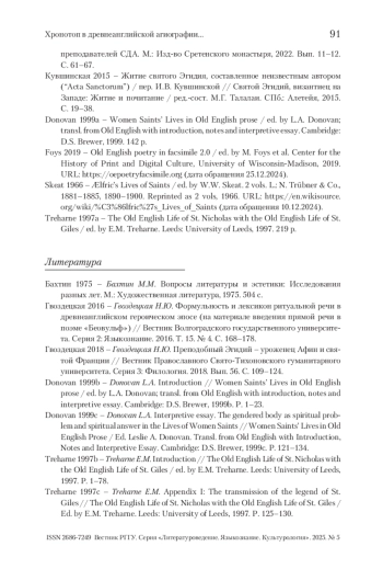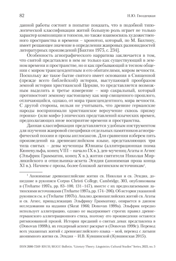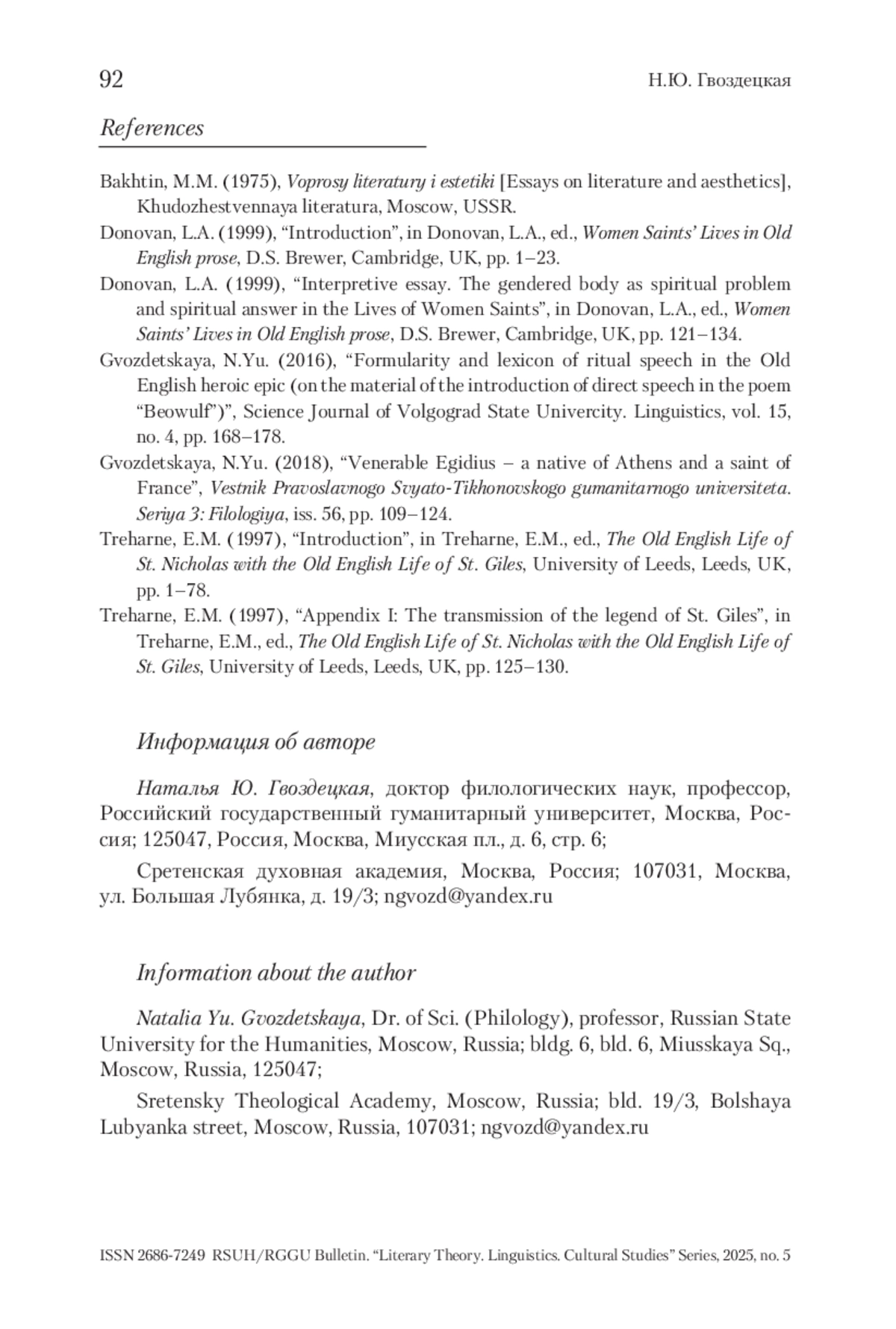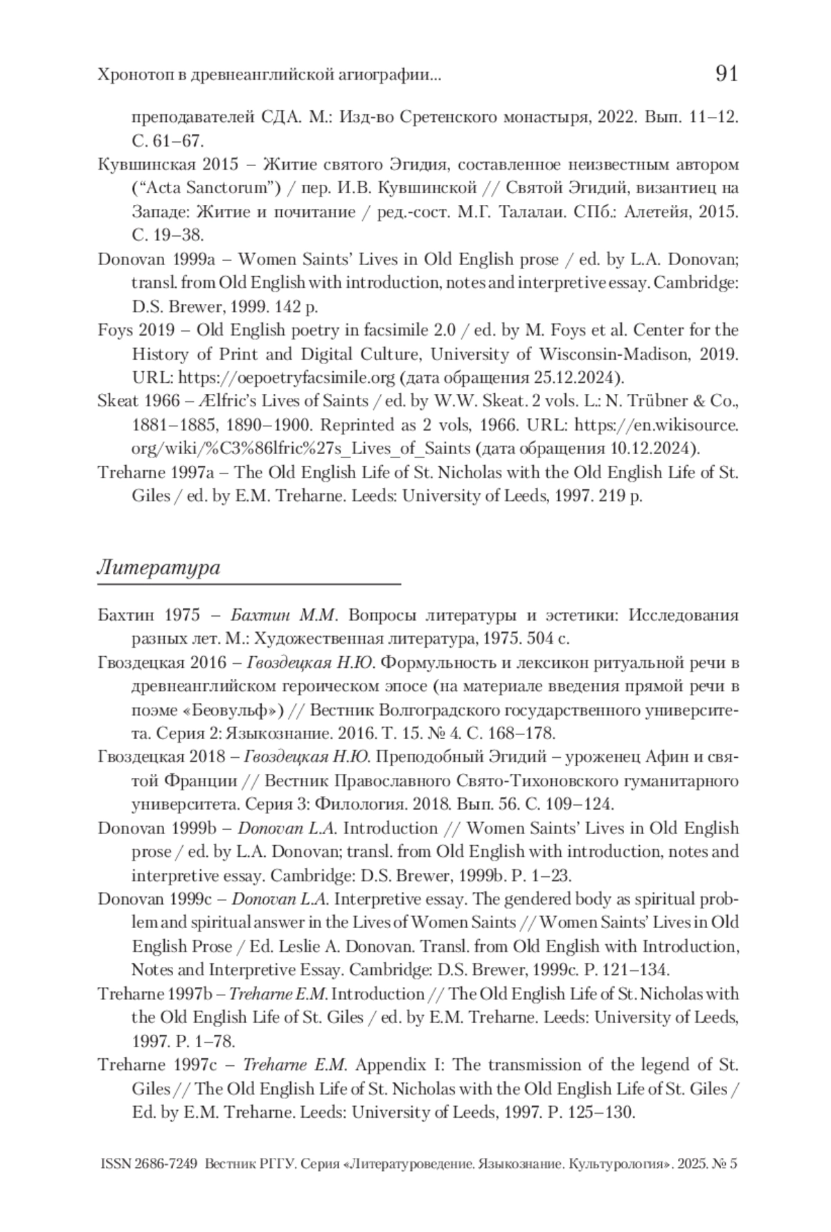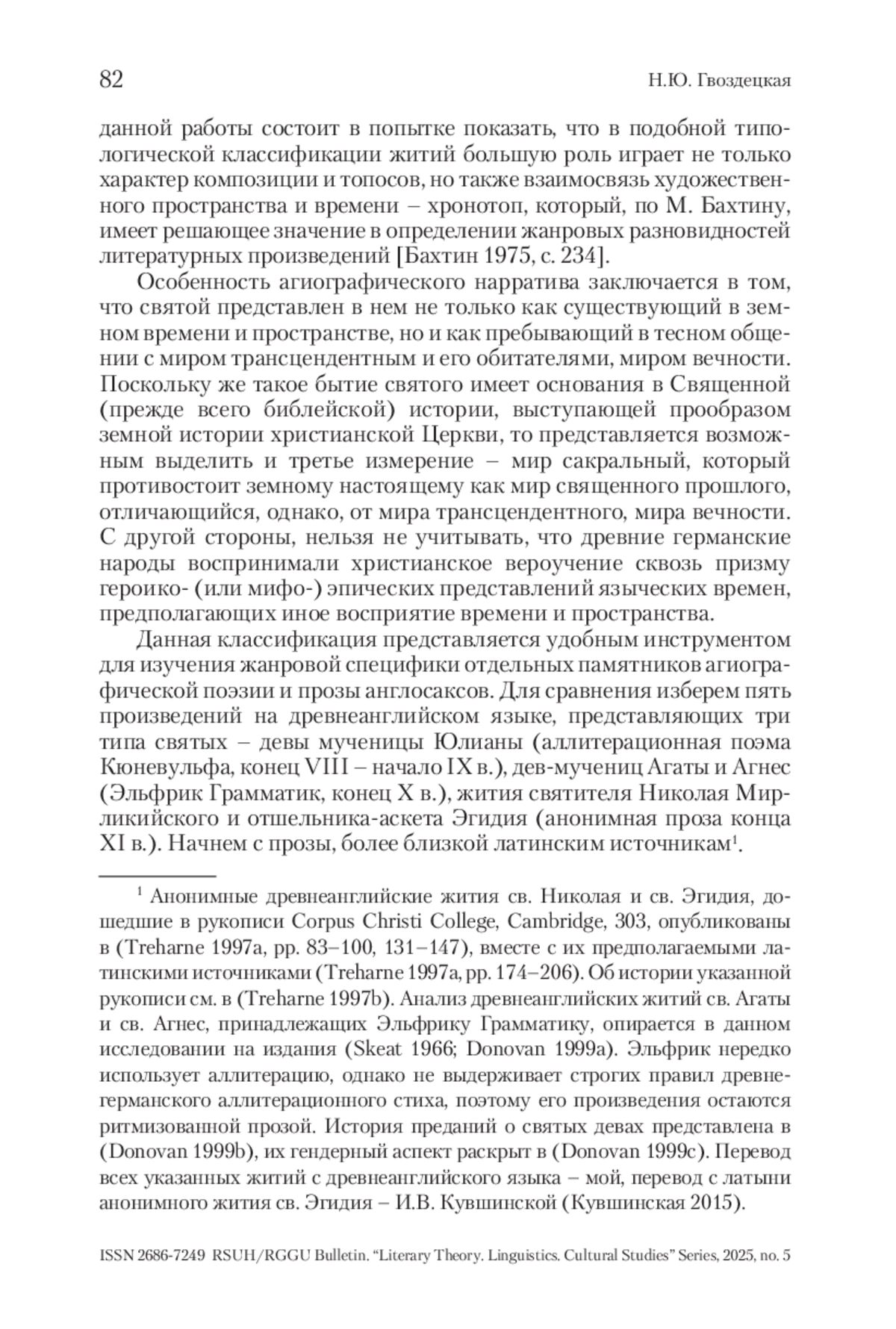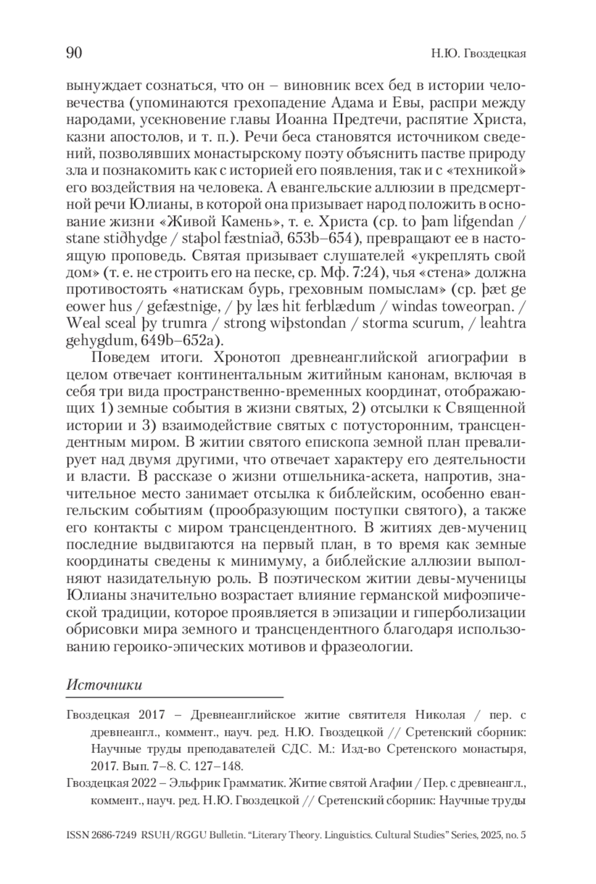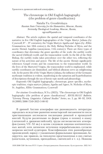 ГВОЗДЕЦКАЯ Н. Ю. ХРОНОТОП В ДРЕВНЕАНГЛИЙСКОЙ АГИОГРАФИИ (ПРОБЛЕМА ЖАНРОВОЙ КЛАССИФИКАЦИИ) // ВЕСТНИК РГГУ. СЕРИЯ «ЛИТЕРАТУРОВЕДЕНИЕ. ЯЗЫКОЗНАНИЕ. КУЛЬТУРОЛОГИЯ». 2025. № 5