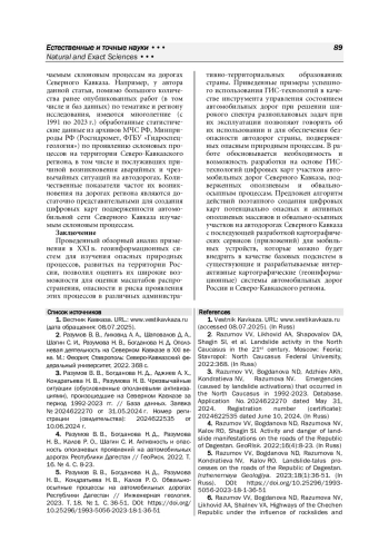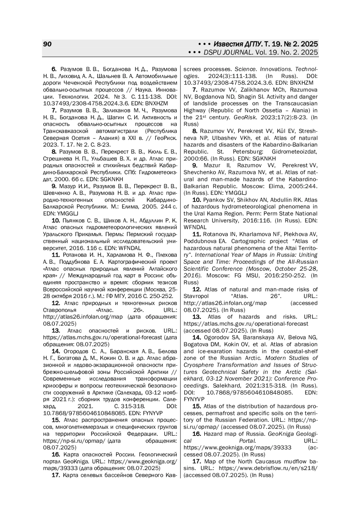 7. Разумов В. В., Залиханов М. Ч., Разумова Н. В., Богданова Н. Д., Шагин С. И. Активность и опасность обвально-осыпных процессов на Транскавказской автомагистрали (Республика Северная Осетия - Алания) в ХХI в. // ГеоРиск. 2023. Т. 17. № 2. С. 8-23.