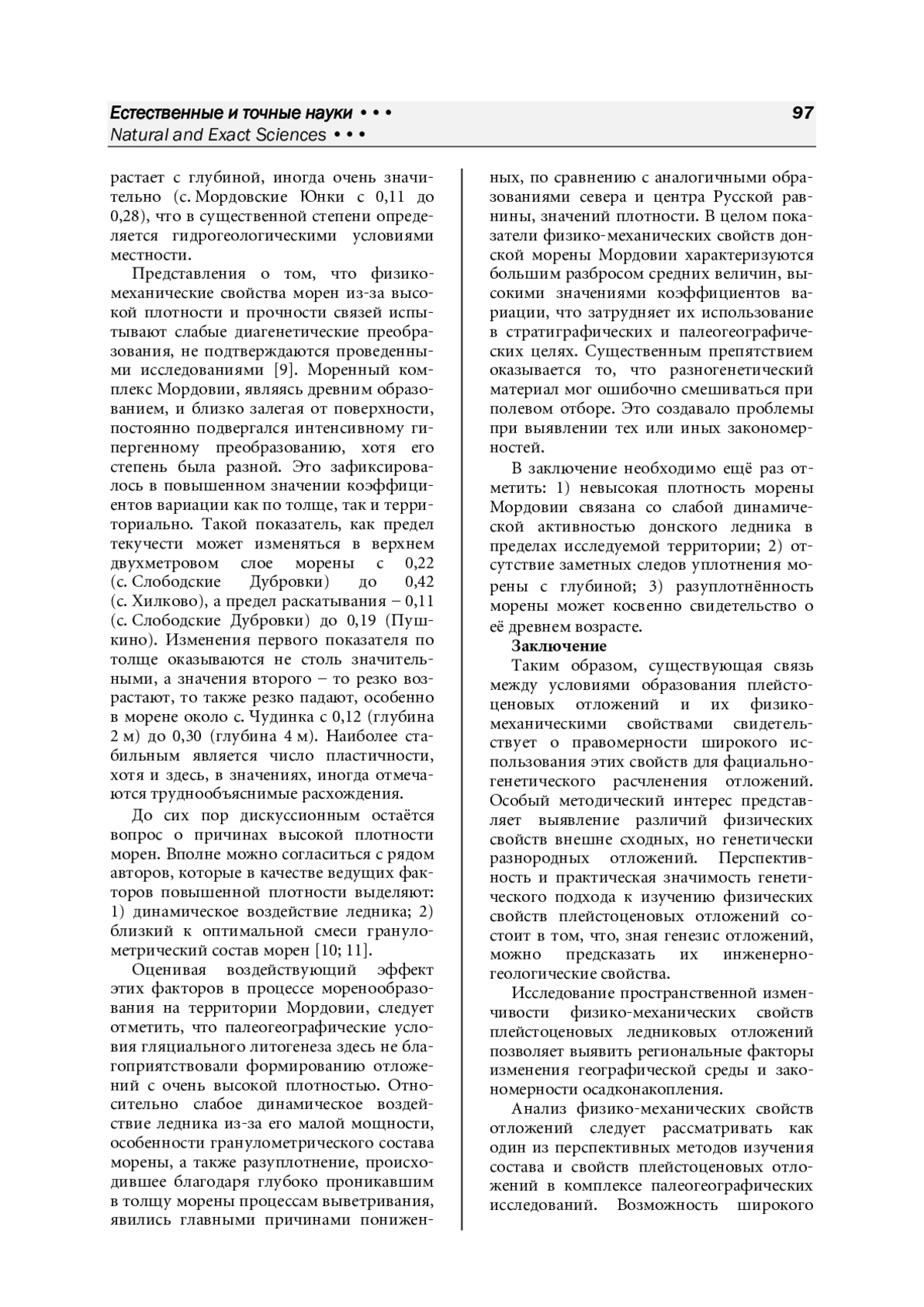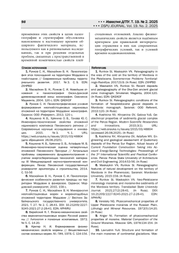 Целью исследования является анализ ряда физико-механических свойств плейстоценовых гляциальных отложений на территории Мордовии. Изучение природы ледниковых районов, базирую-щееся на сопряжённом палеогеографическом анализе, позволяет наметить пути для корреляции разно-генетических типов новейших отложений, а специфика каждого региона Русской равнины помогает понять главные закономерности развития природных комплексов. При палеогеографических рекон-струкциях и стратиграфических построениях для каждого генетического типа отложений используется определённый набор наиболее информативных способов сбора информации. Методы. В соответствии с поставленной целью авторами использовались следующие методы изучения физико-механических свойств ледниковых отложений: исследование предела текучести, предела раскатывания, числа пла-стичности, естественной влажности, объёмного веса скелета, пористости и коэффициента пористости. Результаты. Показана правомерность использования физико-механических свойств в комплексных палеогеографических исследованиях плейстоценовых ледниковых отложений. Выводы. Проведённое исследование показало существующую связь между условиями образования плейстоценовых леднико-вых отложений и их физико-механическими свойствами.