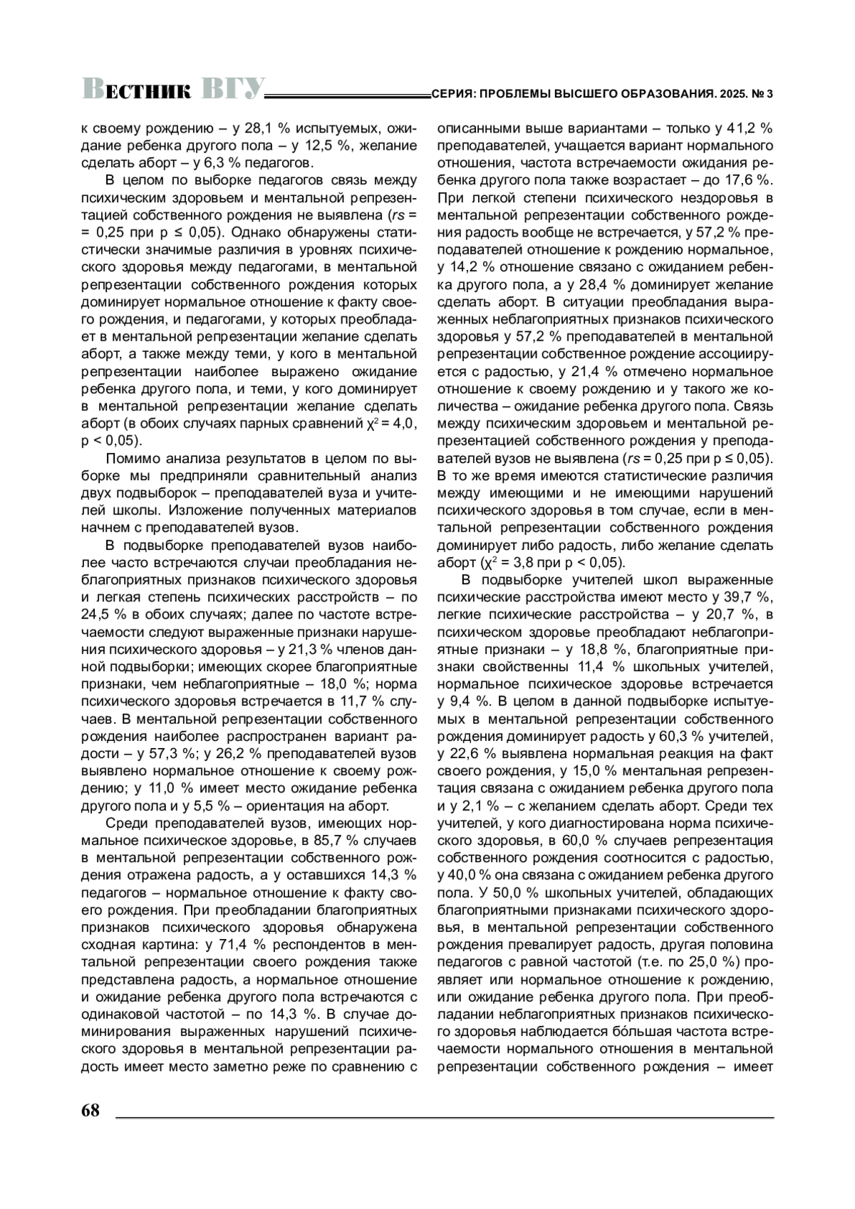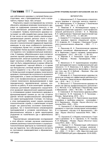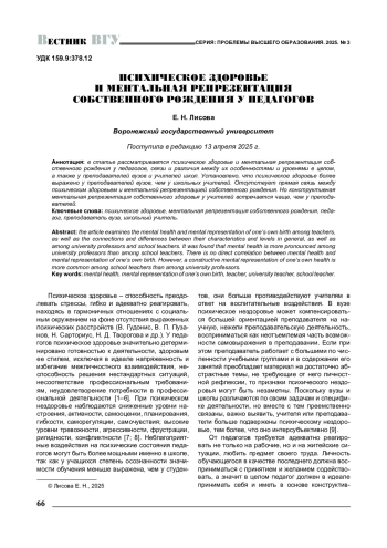 ЛИСОВА Е. Н. ПСИХИЧЕСКОЕ ЗДОРОВЬЕ И МЕНТАЛЬНАЯ РЕПРЕЗЕНТАЦИЯ СОБСТВЕННОГО РОЖДЕНИЯ У ПЕДАГОГОВ // ВЕСТНИК ВОРОНЕЖСКОГО ГОСУДАРСТВЕННОГО УНИВЕРСИТЕТА. СЕРИЯ: ПРОБЛЕМЫ ВЫСШЕГО ОБРАЗОВАНИЯ. 2025. № 3