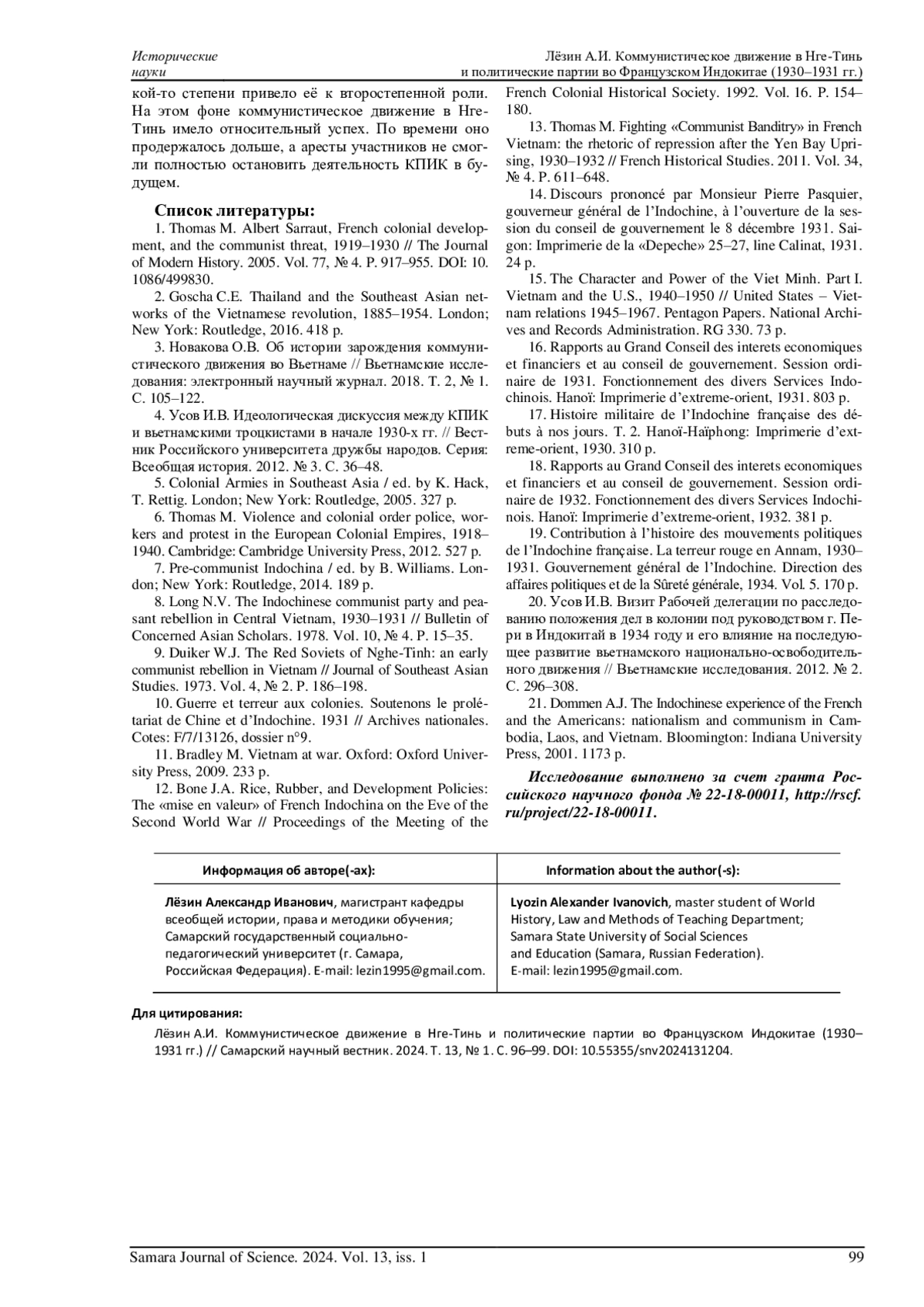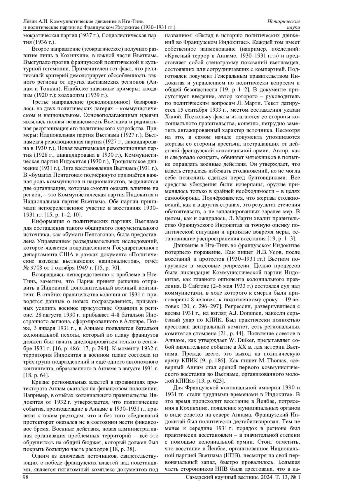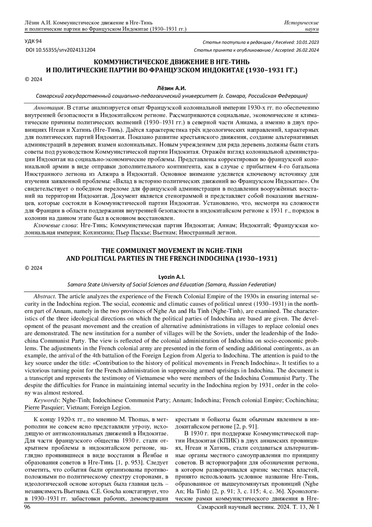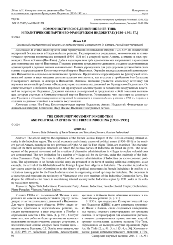 ЛЁЗИН А. И. КОММУНИСТИЧЕСКОЕ ДВИЖЕНИЕ В НГЕ-ТИНЬ И ПОЛИТИЧЕСКИЕ ПАРТИИ ВО ФРАНЦУЗСКОМ ИНДОКИТАЕ (1930-1931 ГГ.) // САМАРСКИЙ НАУЧНЫЙ ВЕСТНИК. 2024. ТОМ 13, № 1