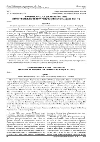 Статья: КОММУНИСТИЧЕСКОЕ ДВИЖЕНИЕ В НГЕ-ТИНЬ И ПОЛИТИЧЕСКИЕ ПАРТИИ ВО ФРАНЦУЗСКОМ ИНДОКИТАЕ (1930-1931 ГГ.) (2024)