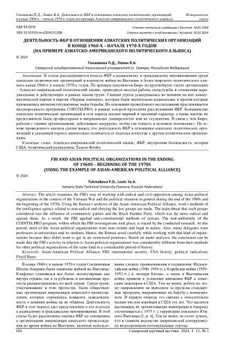 В статье рассматривается подход ФБР к радикализму и гражданскому неповиновению среди азиатских политических организаций в контексте войны во Вьетнаме и более широкого политического климата конца 1960-х и начала 1970-х годов. По архивам документов Бюро на крупнейшую такую организацию - Азиатско-американский политический альянс, приводятся методы работы спецслужбы в отношении нерадикальных и действующих в рамках закона групп. Главная угроза усматривалась во влиянии на них коммунистической партии и партии «Черные пантеры», которые были значительно радикальнее и против которых применялись антиконституционные меры борьбы. На основании проведённого исследования прослеживается неоднородность программы COINTELPRO, в рамках которой проходили расследования ФБР. Большинство азиатских политических организаций в этот период носили мирный и законный характер, а также многие их представители были профессорами в американских университетах или их студентами. В связи с чем Бюро, работая с такими организациями, действовало аккуратно, чтобы «не попасть в неловкое положение». На основе проведенного анализа сделан вывод, что деятельность ФБР в отношении азиатских политических организаций в указанный период значительно отличается от подхода агентства к другим политическим организациям.