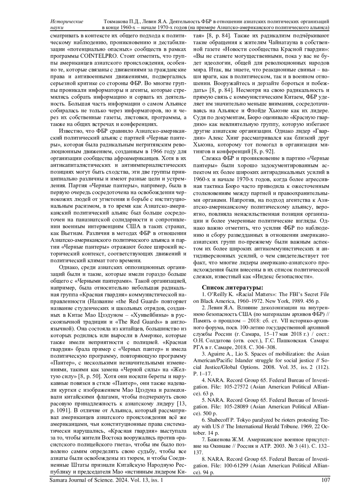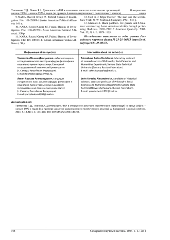 2. Левин Я.А. Влияние деколонизации на внутреннюю безопасность США (по материалам архивов ФБР) // Память о прошлом - 2018: сб. ст. VII историко-архивного форума, посв. 100-летию государственной архивной службы России (г. Самара, 15-17 мая 2018 г.) / сост.: О.Н. Солдатова (отв. сост.), Г.С. Пашковская. Самара: РГА в г. Самаре, 2018. С. 304-308. EDN: YRUTFZ