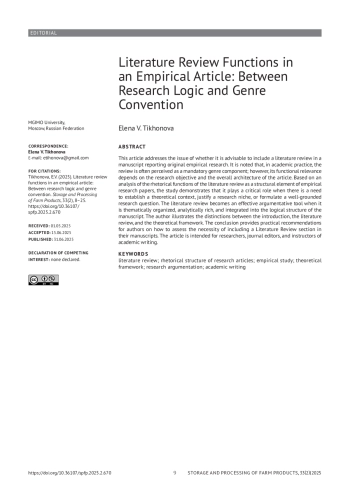 В статье рассматривается вопрос о целесообразности включения литературного обзора в рукопись оригинального эмпирического исследования. Отмечается, что в академической практике обзор нередко воспринимается как обязательный жанровый компонент, однако его функциональная нагрузка зависит от исследовательской задачи и архитектуры статьи. На основе анализа риторических функций литературного обзора как структурного компонента оригинального эмпирического исследования показано, что он выполняет критически важные роли в тех случаях, когда необходимо выстроить теоретический контекст, обосновать исследовательскую нишу или сформулировать научно обоснованный исследовательский вопрос. Литературный обзор становится продуктивным инструментом аргументации, если он тематически организован, аналитически насыщен и встроен в логическую структуру статьи. Автор иллюстрирует разграничение между введением, литературным обзором и теоретическим обоснованием. В заключении даются рекомендации авторам по оценке необходимости включения раздела Литературный обзор в текст рукописи. Статья адресована исследователям, редакторам и преподавателям академического письма.
