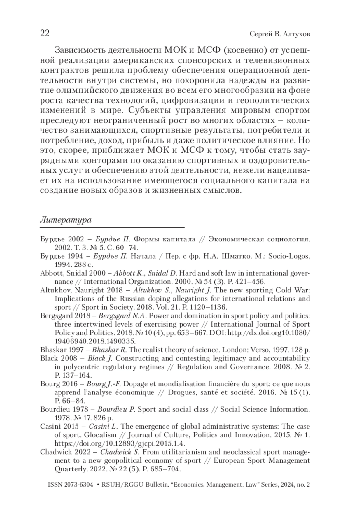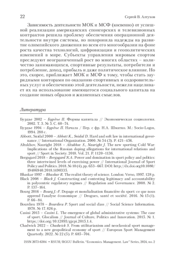 4. Altukhov, Nauright 2018 - Altukhov S., Nauright J. The new sporting Cold War: Implications of the Russian doping allegations for international relations and sport // Sport in Society. 2018. Vol. 21. P. 1120-1136.