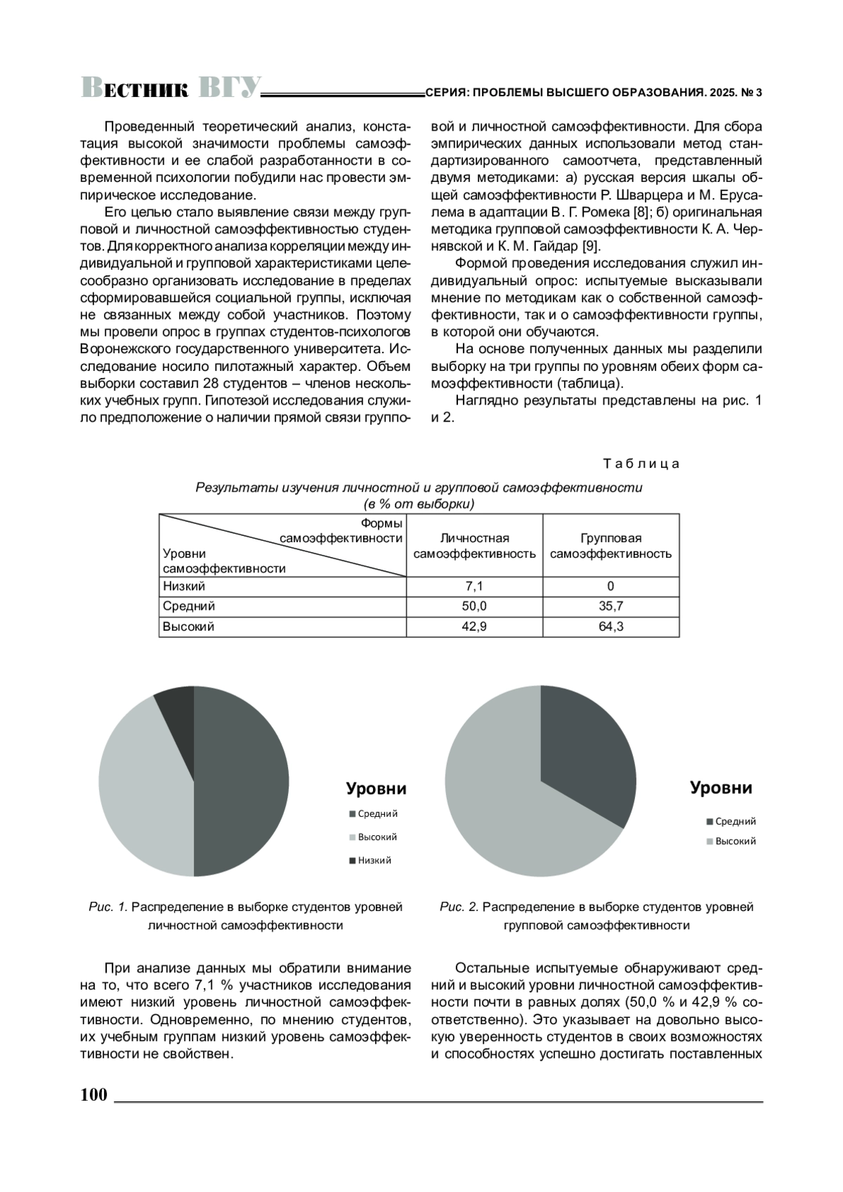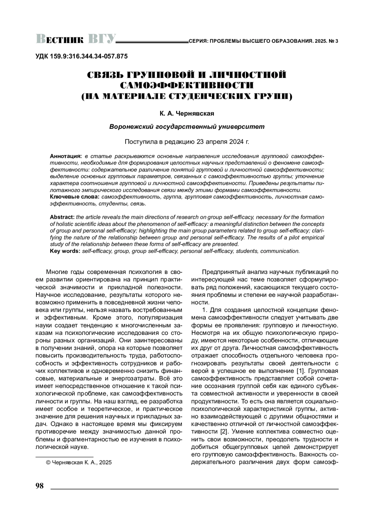 ЧЕРНЯВСКАЯ К. А. СВЯЗЬ ГРУППОВОЙ И ЛИЧНОСТНОЙ САМОЭФФЕКТИВНОСТИ (НА МАТЕРИАЛЕ СТУДЕНЧЕСКИХ ГРУПП) // ВЕСТНИК ВОРОНЕЖСКОГО ГОСУДАРСТВЕННОГО УНИВЕРСИТЕТА. СЕРИЯ: ПРОБЛЕМЫ ВЫСШЕГО ОБРАЗОВАНИЯ. 2025. № 3