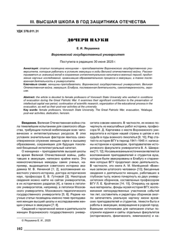 Статья посвящена женщинам - преподавателям Воронежского государственного университета, которые работали в условиях эвакуации в годы Великой отечественной войны. Рассматривается их значимый вклад в сохранение интеллектуального капитала в военный период, продолжение научных исследований, организацию образовательного процесса в эвакуации, а также послевоенная деятельность в университете.