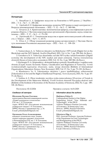 2. Городнова Н. В. Цифровая экономика: развитие NFT-рынка и смарт-контрактов // Вопросы инновационной экономики. - 2022. - Т. 12. - № 2. - С. 949-966. EDN: YCMOXW