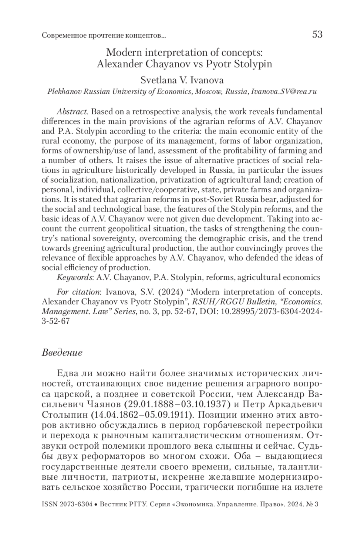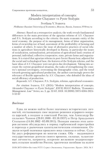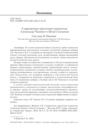 На основе ретроспективного анализа в работе выявлены принципиальные расхождения основных положений аграрных реформ А. В. Чаянова и П. А. Столыпина по критериям: основной хозяйствующий субъект сельской экономики, цель хозяйствования, формы организации труда, формы собственности/пользования на землю, оценка выгодности ведения хозяйства и ряд других.