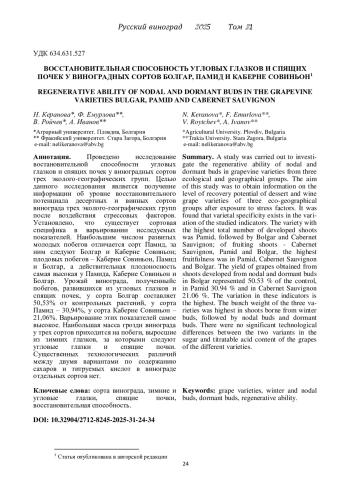 Проведено исследование востановительной способности угловых глазков и спящих почек у виноградных сортов трех эколого-географических групп. Целью данного исследования является получение информации об уровне восстановительного потенциала десертных и винных сортов винограда трех эколого-географических групп после воздействия стрессовых факторов. Установлено, что существует сортовая специфика в варьировании исследуемых показателей. Наибольшим числом развитых молодых побегов отличается сорт Памид, за ним следуют Болгар и Каберне Совиньон; плодовых побегов – Каберне Совиньон, Памид и Болгар, а действительная плодоносность самая высокая у Памида, Каберне Совиньон и Болгар. Урожай винограда, полученныйс побегов, развившихся из угловых глазков и спящих почек, у сорта Болгар составляет 50,53% от контрольных растений, у сорта Памид – 30,94%, у сорта Каберне Совиньон – 21,06%. Варьирование этих показателей самое высокое. Наибольшая масса грозди винограда у трех сортов приходится на побеги, выросшие из зимних глазков, за которыми следуют угловые глазки и спящие почки. Существенных технологических различий между двумя вариантами по содержанию сахаров и титруемых кислот в винограде отдельных сортов нет.
