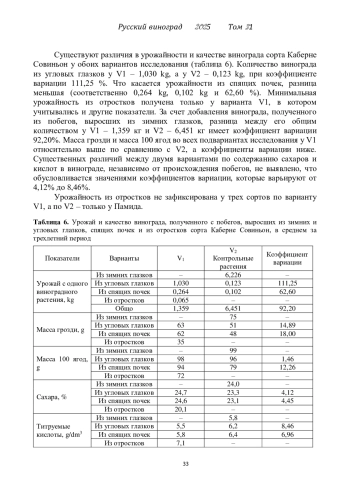 Приведены результаты изучения в 2024 году увологических показателей столовых и бессемянных сортов винограда, произрастающих на Донской ампело-графической коллекции имени Я. И. Потапенко (г. Новочеркасск, Ростовская область). Сорта изучали в привитой культуре (подвой Кобер 5ББ), схема посадки 3,0×1,5 м. Изучение сортов проводили с использованием общепринятых в виноградарстве методик. Объектом исследований был 21 столовый и бессемянный сорт винограда, различного происхождения и срока созревания. Очень высокая сахаристость сока ягод была у сортов: Беркарат, Низина, Аку-Аку, Кишмиш Узбекистан. Титруемая кислотность у изучаемых сортов была в пределах от 4,2 г/дм3 (Вестфризия) до 9,6 г/дм3 (Кишмиш ваткана). Наиболее крупные грозди были у 10 сортов, среди них: Бессемянный Магарача, Кишмиш Узбекистан, Кишмиш лучистый, Витроблэк, Боготя-новский, Реа, Аку-Аку и др. Очень крупные ягоды (по диаметру) были у 4 сортов – Боготяновский, Русмол, Вестфризия, Виктория. Наибольшая средняя масса ягоды была у сортов ‒ Боготяновский (9,1 г), Вестфризия (7,2 г), Русмол (6,9 г), Дольчатый (6,8 г). Среди бессемянных сортов наиболее крупные ягоды были у сорта Кишмиш лучистый (3,9 г). Наиболее высокие дегустационные оценки (по 10-балльной шкале) получили сорта: Кишмиш лучистый (9,6), Витроблэк, Боготяновский (9,0 баллов). По данным проведенных исследований выделены по комплексу увологических показателей столовые сорта ‒ Боготяновский, Русмол, Вестфризия, Виктория; среди бессемянных сортов ‒ Витроблэк, Кишмиш лучистый, Кишмиш Узбекистан.