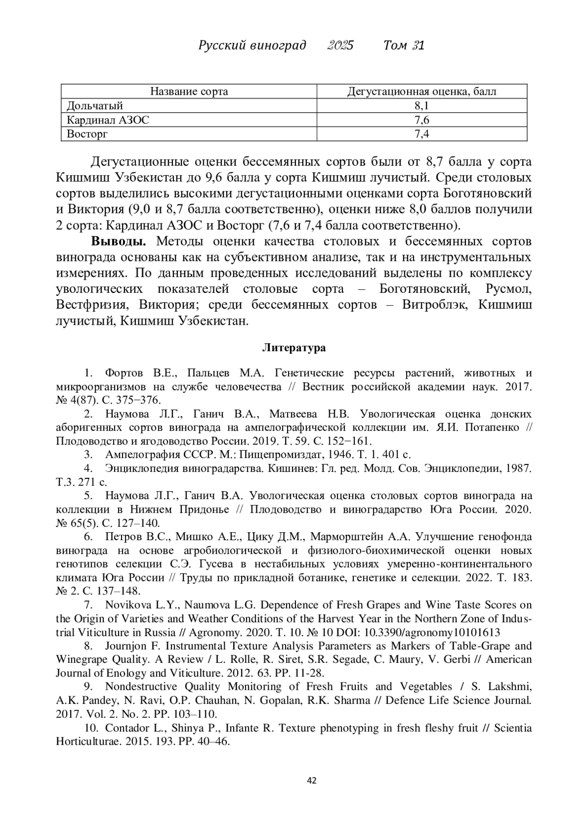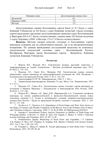 НАУМОВА Л. Г., ГАНИЧ В. А. УВОЛОГИЧЕСКАЯ ОЦЕНКА СТОЛОВЫХ И БЕССЕМЯННЫХ СОРТОВ ВИНОГРАДА НА КОЛЛЕКЦИИ В 2024 ГОДУ // РУССКИЙ ВИНОГРАД. 2025. № 31