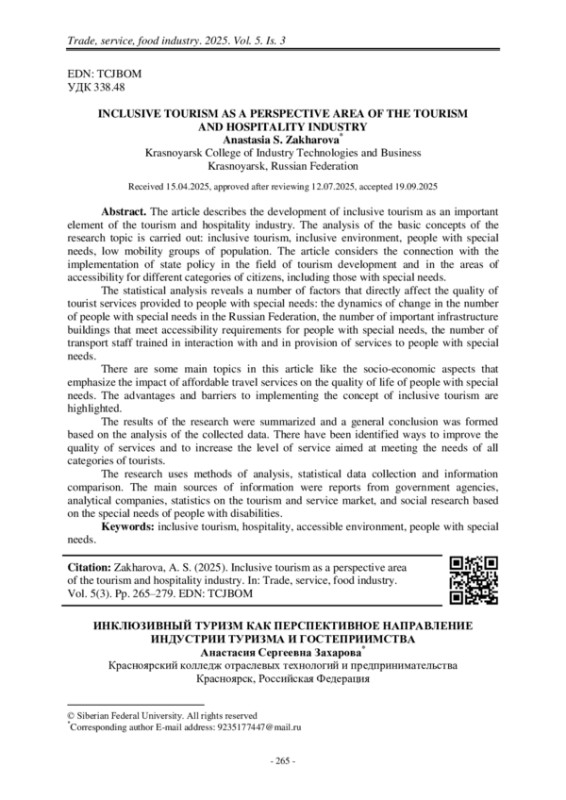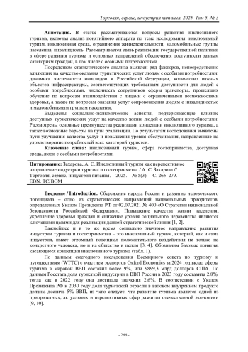 Выделены социально-экономические аспекты, подчеркивающие влияние доступных туристических услуг на качество жизни людей с особыми потребностями. Рассмотрены основные преимущества реализации концепции инклюзивного туризма, а также возможные барьеры на пути реализации. По результатам исследования выявлены пути улучшения качества услуг и повышения уровня обслуживания, направленные на удовлетворение потребностей всех категорий туристов.