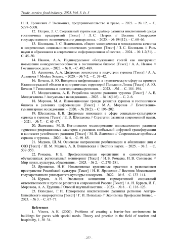 1. Вызова, А. К. Проблемы создания безбарьерной среды в средствах размещения для гостей с ограниченными возможностями [Текст] / А. К. Вызова // Актуальные вопросы теории и практики в сфере туризма и гостеприимства. - 2020. - № 1. - С. 30-34.