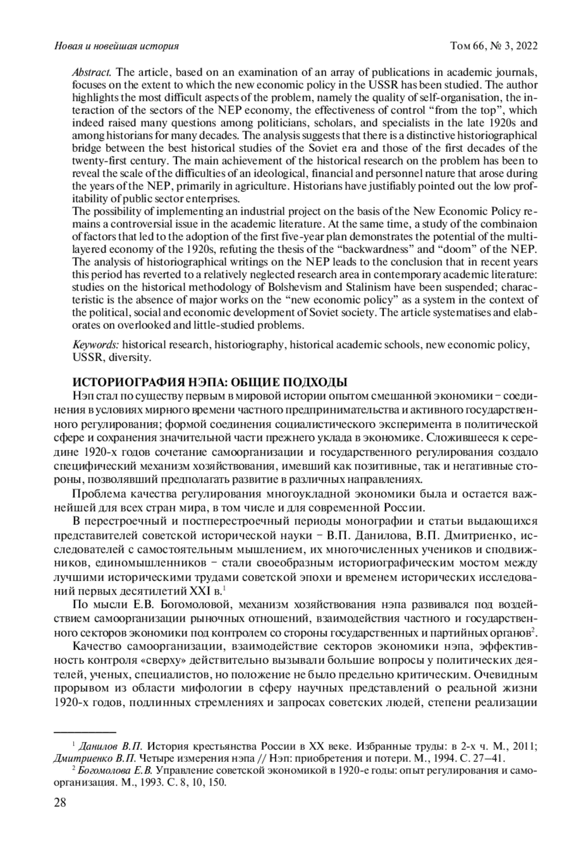 Статья, опирающаяся на изучение массива публикаций исследователей в научных журналах, посвящена степени изученности новой экономической политики в СССР. Выделены наиболее сложные проблемы ‒ качество самоорганизации; взаимодействие секторов экономики нэпа; эффективность контроля «сверху» – действительно вызывавшие большие вопросы у политических деятелей, ученых, специалистов в конце 1920-х годов и историков на протяжении многих десятилетий. Проведенный анализ позволяет сделать вывод о существовании своеобразного историографического моста между лучшими историческими трудами советской эпохи и временем исторических исследований первых десятилетий ХХI в., главным достижением которых стало выявление масштаба трудностей идеологического, финансового, кадрового характера, возникших в годы нэпа прежде всего в сельском хозяйстве. Историки обоснованно указывают на низкую рентабельность предприятий госсектора.