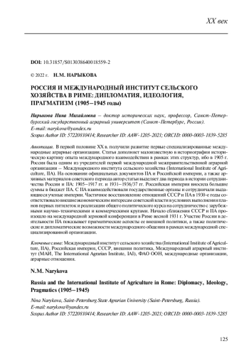 В первой половине XX в. получили развитие первые специализированные международные аграрные организации. Статья дополняет малоизвестную в историографии историческую картину опыта международного взаимодействия в рамках этих структур, ибо в 1905 г. Россия была одним из учредителей первой международной межправительственной аграрной организации – Международного института сельского хозяйства (International Institute of Agriculture, IIA). На основании официальных документов IIA и Российской империи, а также архивных материалов советского периода автор статьи выделяет два периода в истории сотрудничества России и IIA: 1905–1917 гг. и 1931–1936/37 гг. Российская империя вносила большие суммы в бюджет IIA. С IIA взаимодействовали государственные органы и сотрудничали выдающиеся ученые империи. Частичное восстановление отношений СССР и IIA в 1930-е годы соответствовало внешнеэкономическим интересам советской власти в условиях выполнения планов первых пятилеток и реализации общего политического курса на сотрудничество с зарубежными научно-техническими и коммерческими кругами. Начало сближения СССР и IIA произошло на международной зерновой конференции в Риме весной 1931 г. Участие России в деятельности IIA показывает прагматические аспекты ее внешней политики, а также политические и дипломатические возможности международного общения в рамках международной специализированной организации