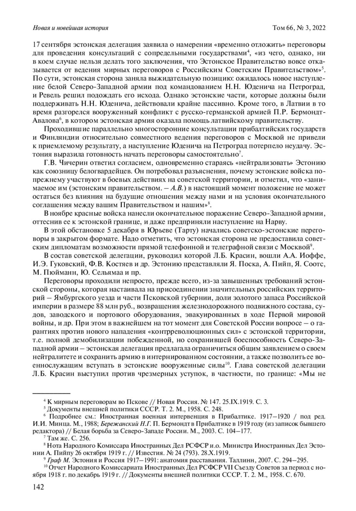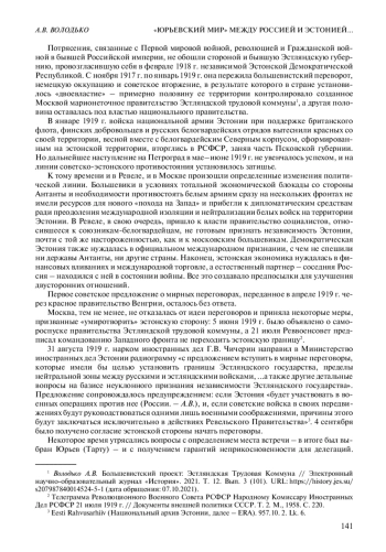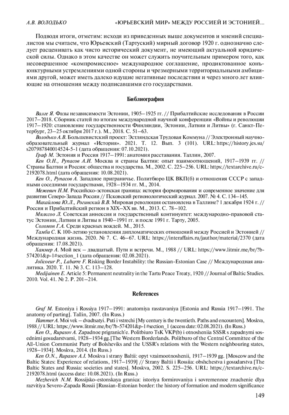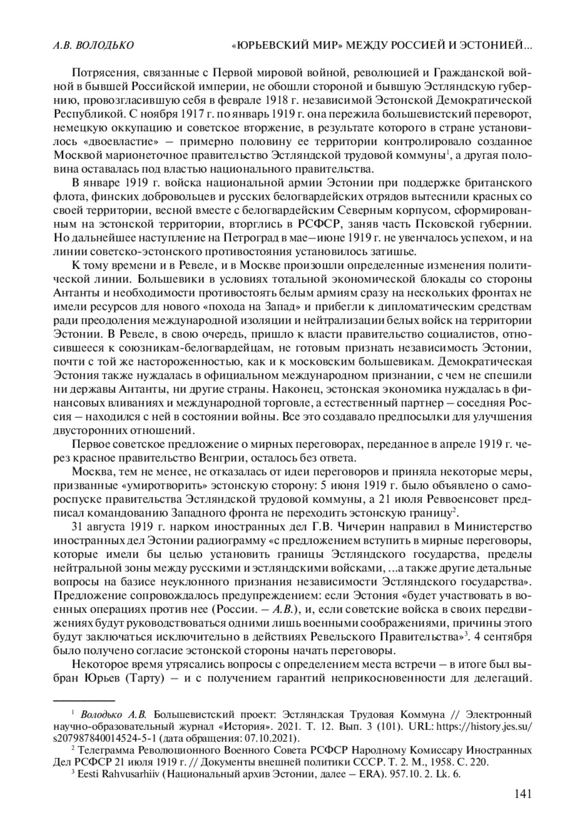 ВОЛОДЬКО А. В. "ЮРЬЕВСКИЙ МИР" МЕЖДУ РОССИЕЙ И ЭСТОНИЕЙ: ИСТОРИЯ ЗАКЛЮЧЕНИЯ И ПОСЛЕДСТВИЯ // НОВАЯ И НОВЕЙШАЯ ИСТОРИЯ. 2022. № 3