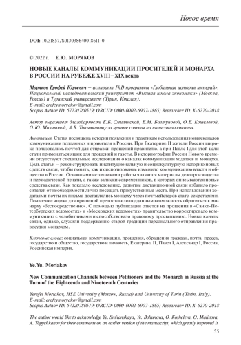Статья посвящена истории появления и практикам использования новых каналов коммуникации подданных и правителя в России. При Екатерине II жители России широко пользовались почтой для отправки прошений правителю, а при Павле I для этой цели стали применяться ящик для прошений и газеты. В историографии России Нового времени отсутствуют специальные исследования о каналах коммуникации ходатаев и монарха. Цель статьи – реконструировать институциональную и социокультурную историю новых средств связи, чтобы понять, как их использование изменило коммуникацию власти и общества в России. Основными источниками работы являются материалы делопроизводства и периодической печати, а также записки современников, в которых описываются новые средства связи. Как показало исследование, развитие дистанционной связи избавило просителей от необходимости лично посещать присутственные места. При использовании ходатаями почты их письма доставлялись монарху через почтмейстеров статс-секретарями. Появление ящика для прошений предоставило подданным возможность обратиться к монарху «беспосредственно». С помощью публикации ответов на прошения в «Санкт-Петербургских ведомостях» и «Московских ведомостях» правительство корректировало коммуникацию с челобитчиками и способствовало правовому просвещению. Новые каналы связи, однако, служили поддержанию старой традиции персонального отправления правосудия монархом