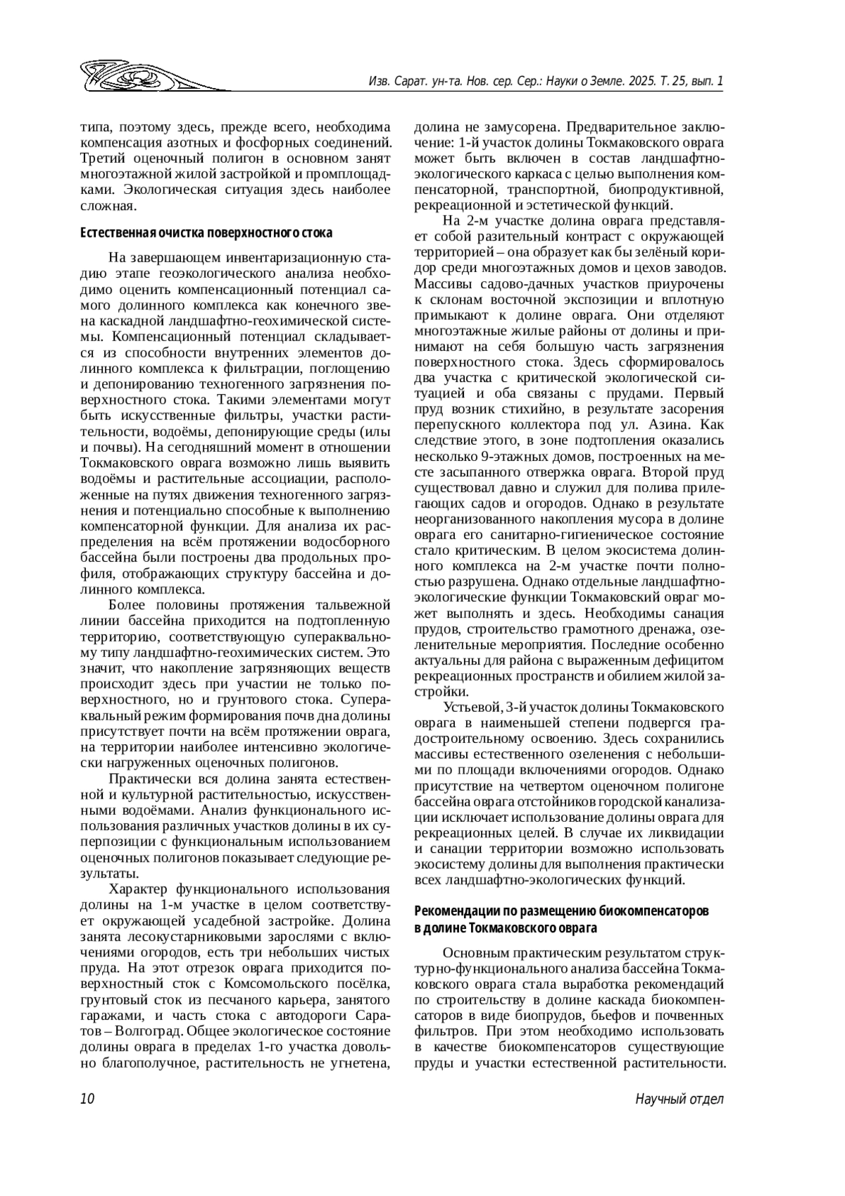БАШКАТОВ А. Н. ИНТЕГРИРОВАННАЯ МОДЕЛЬ ОЦЕНКИ ЭКОЛОГИЧЕСКОЙ ФУНКЦИИ ДОЛИННЫХ КОМПЛЕКСОВ ПО ОЧИСТКЕ ПОВЕРХНОСТНОГО СТОКА // ИЗВЕСТИЯ САРАТОВСКОГО УНИВЕРСИТЕТА. НОВАЯ СЕРИЯ. СЕРИЯ НАУКИ О ЗЕМЛЕ. 2025. Т. 25 № 1