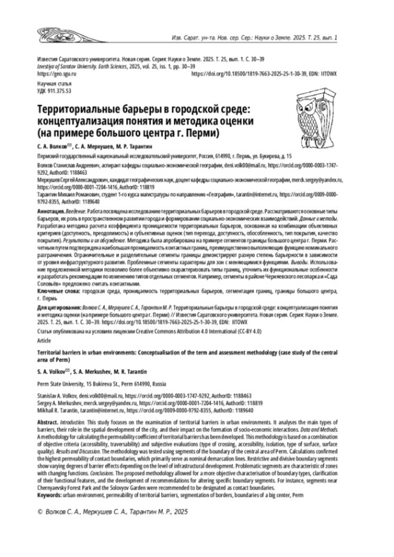 ВОЛКОВ С. А., МЕРКУШЕВ С. А., ТАРАНТИН М. Р. ТЕРРИТОРИАЛЬНЫЕ БАРЬЕРЫ В ГОРОДСКОЙ СРЕДЕ: КОНЦЕПТУАЛИЗАЦИЯ ПОНЯТИЯ И МЕТОДИКА ОЦЕНКИ (НА ПРИМЕРЕ БОЛЬШОГО ЦЕНТРА Г. ПЕРМИ) // ИЗВЕСТИЯ САРАТОВСКОГО УНИВЕРСИТЕТА. НОВАЯ СЕРИЯ. СЕРИЯ НАУКИ О ЗЕМЛЕ. 2025. Т. 25 № 1