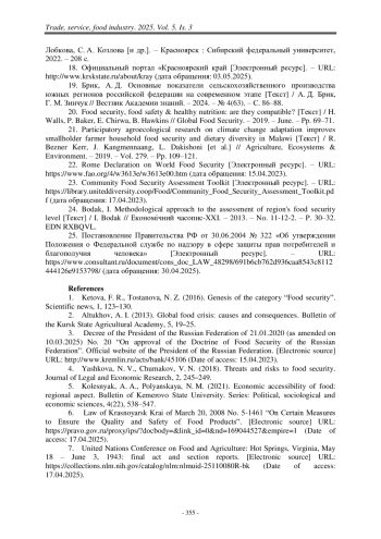 5. Колесняк, А. А. Экономическая доступность продовольствия: региональный аспект [Текст] / А. А. Колесняк, Н. М. Полянская // Вестник Кемеровского государственного университета. Серия: Политические, социологические и экономические науки. – 2021. – № 4(22). – С. 538–547.
