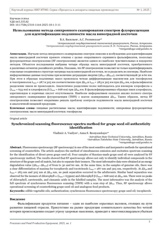 18. Васильев В.А., Реснянская А.С. Использование 3D-спектров флуоресценции для идентификации подлинности масла виноградной косточки // Научный журнал НИУ ИТМО. Серия: Процессы и аппараты пищевых производств. 2024. № 3. С. 10-17.