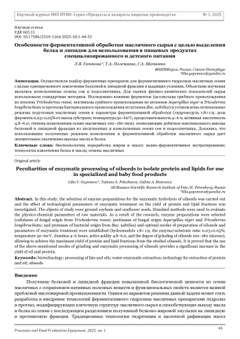 Статья: Особенности ферментативной обработки масличного сырья с целью выделения белка и липидов для использования в пищевых продуктах специализированного и детского питания (2025)