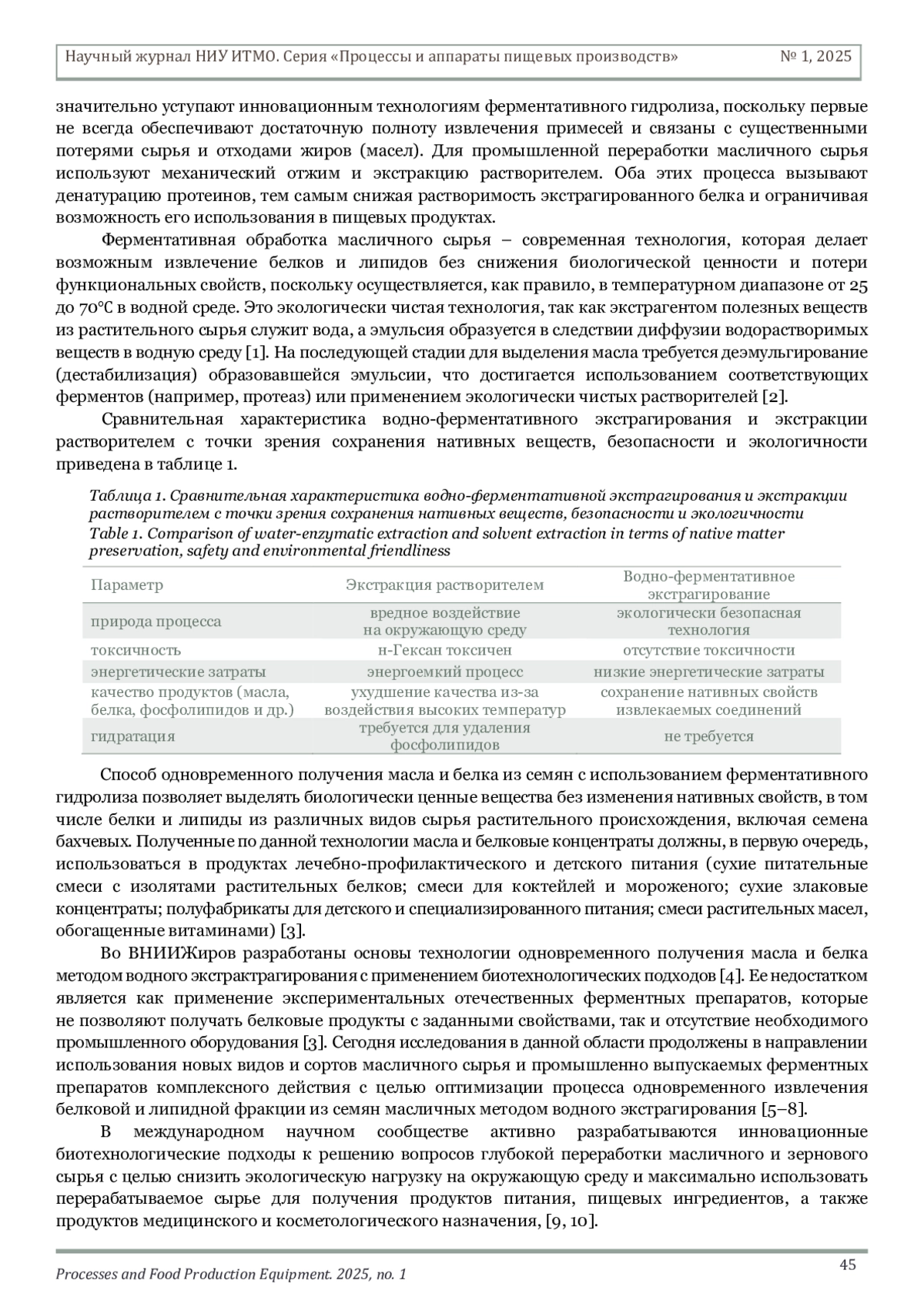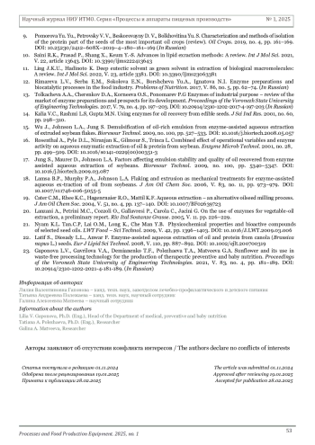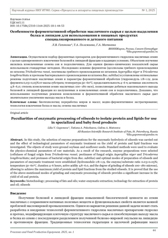 ГАПОНОВА Л. В., ПОЛЕЖАЕВА Т. А., МАТВЕЕВА Г. А. ОСОБЕННОСТИ ФЕРМЕНТАТИВНОЙ ОБРАБОТКИ МАСЛИЧНОГО СЫРЬЯ С ЦЕЛЬЮ ВЫДЕЛЕНИЯ БЕЛКА И ЛИПИДОВ ДЛЯ ИСПОЛЬЗОВАНИЯ В ПИЩЕВЫХ ПРОДУКТАХ СПЕЦИАЛИЗИРОВАННОГО И ДЕТСКОГО ПИТАНИЯ // НАУЧНЫЙ ЖУРНАЛ НИУ ИТМО. СЕРИЯ: ПРОЦЕССЫ И АППАРАТЫ ПИЩЕВЫХ ПРОИЗВОДСТВ. 2025. № 1 (63)