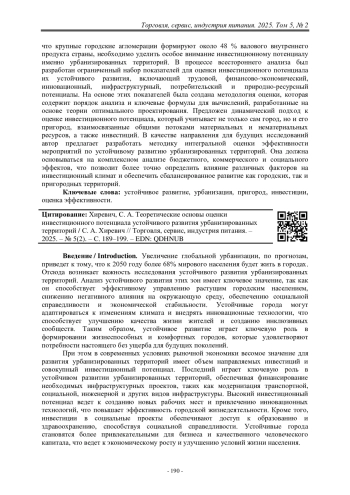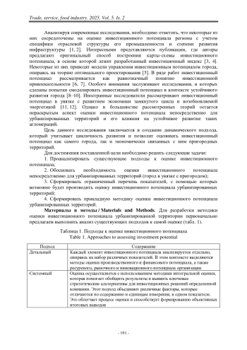 Существующие подходы к оценке инвестиционного потенциала часто не учитывают сложные взаимосвязи между городом и его окрестностями. Большинство методик сосредоточено на анализе совокупности блоков факторов, таких как инфраструктура, экономика, социальное положение и экология, однако этого недостаточно для всесторонней оценки инвестиционной привлекательности. Учитывая, что крупные городские агломерации формируют около 48 % валового внутреннего продукта страны, необходимо уделить особое внимание инвестиционному потенциалу именно урбанизированных территорий. В процессе всестороннего анализа был разработан ограниченный набор показателей для оценки инвестиционного потенциала их устойчивого развития, включающий трудовой, финансово-экономический, инновационный, инфраструктурный, потребительский и природно-ресурсный потенциалы. На основе этих показателей была создана методология оценки, которая содержит порядок анализа и ключевые формулы для вычислений, разработанные на основе теории оптимального проектирования. Предложен динамический подход к оценке инвестиционного потенциала, который учитывает не только сам город, но и его пригород, взаимосвязанные общими потоками материальных и нематериальных ресурсов, а также инвестиций. В качестве направления для будущих исследований автор предлагает разработать методику интегральной оценки эффективности мероприятий по устойчивому развитию урбанизированных территорий. Она должна основываться на комплексном анализе бюджетного, коммерческого и социального эффектов, что позволит более точно определить влияние различных факторов на инвестиционный климат и обеспечить сбалансированное развитие как городских, так и пригородных территорий.