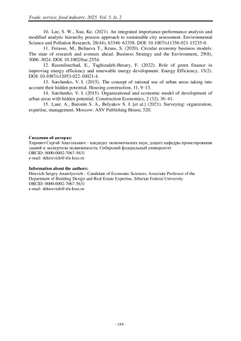 13. Сарченко, В. И. Концепция рационального использования городских территорий с учетом их скрытого потенциала [Текст] / В. И. Сарченко // Жилищное строительство. – 2015. – № 11. – С. 9–13.
