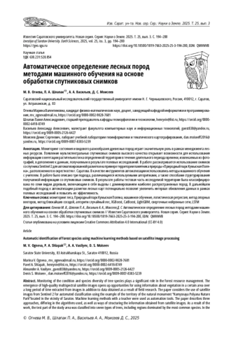 9. Polyakova A., Mukharamova S., Yermolaev O., Shaykhutdinova G. Automated Recognition of Tree Species Composition of Forest Communities Using Sentinel-2 Satellite Data // Remote Sensing 2023. Vol. 15, iss. 2. Art. 329. ,. DOI: 10.3390/rs15020329 EDN: JHMBXQ