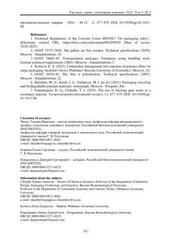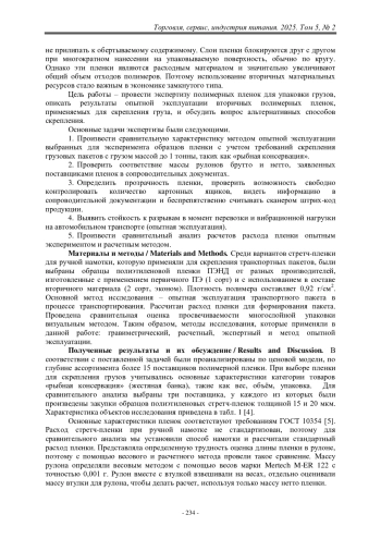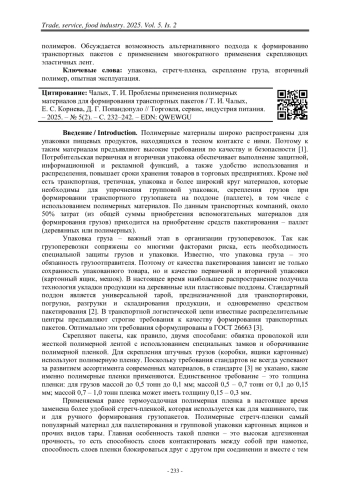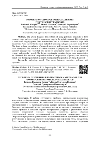 Полимерные материалы широко распространены для упаковки пищевых продуктов, находящихся в тесном контакте с ними. Поэтому к таким материалам предъявляют высокие требования по качеству и безопасности [1]. Потребительская первичная и вторичная упаковка обеспечивает выполнение защитной, информационной и рекламной функций, а также удобство использования и распределения, повышает сроки хранения товаров в торговых предприятиях. Кроме неё есть транспортная, третичная, упаковка и более широкий круг материалов, которые необходимы для упрочнения групповой упаковки, скрепления грузов при формировании транспортного грузопакета на поддоне (паллете), в том числе с использованием полимерных материалов. По данным транспортных компаний, около 50% затрат (из общей суммы приобретения вспомогательных материалов для формирования грузов) приходится на приобретение средств пакетирования – паллет (деревянных или полимерных).